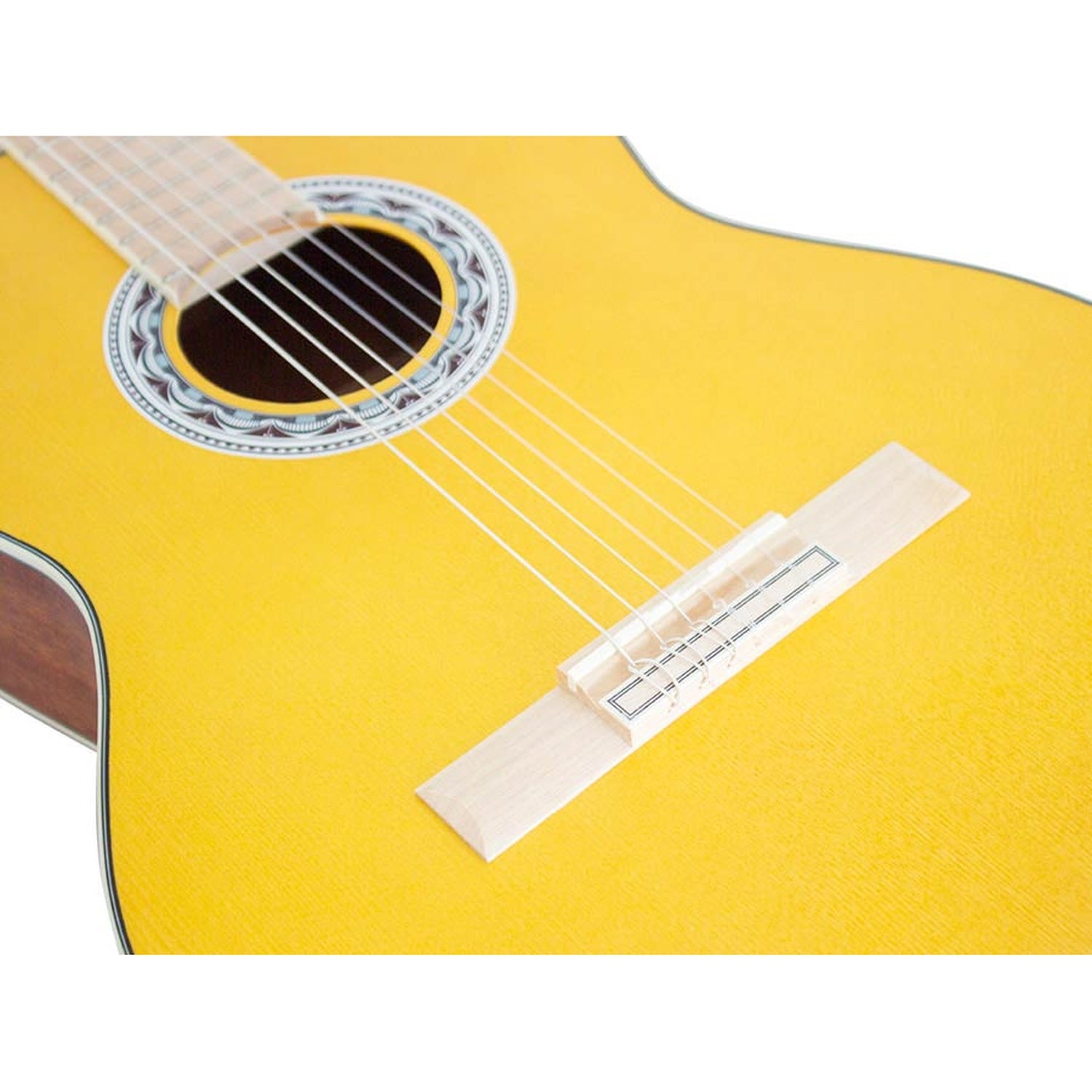 The maple fingerboard and ivory ABS binding contribute to the guitar's refined look, as does the GraphTech NuBone bridge saddle for enhanced tone and projection. It's fitted with USA strings for a brilliant tone. The chrome-plated machine heads with pearloid buttons guarantee reliable tuning.