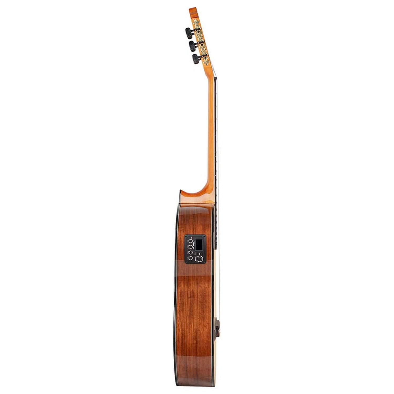 The VC564CE also features a cutaway design , making playing on the higher frets effortless . Thanks to the Valencia 3-Band EQ preamp and built-in chromatic tuner, you can easily tailor the sound to any situation, making this guitar an excellent choice for live performances and recording .