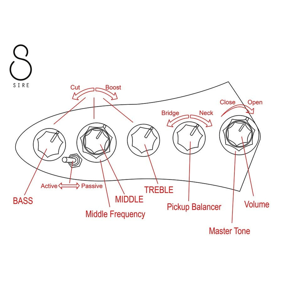 • Controls: Volume/tone (dual pot), pickup blender, treble, mid/mid freq (dual pot), bass, mini toggle (active/passive)
