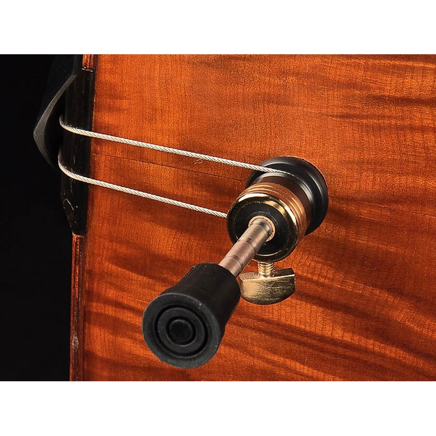 The RB-214 is a 1/4-inch double bass with a laminated wooden top, ebony fingerboard, and flamed spirit varnish. It features four single machine heads and is very solidly built.