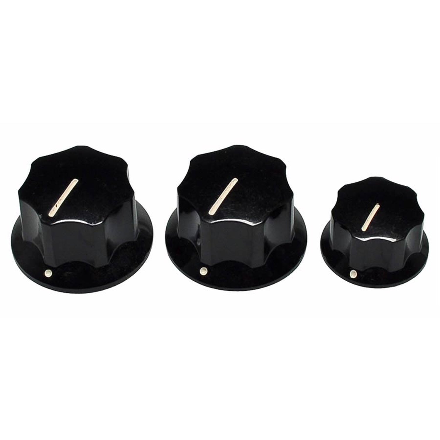 Set of three black control knobs for Fender Jazz Bass and Mustang, designed for CTS scales. These knobs (volume, tone, and volume) feature setscrews and white indicator lines. Fits 1/4" split-shaft potentiometers on most Jazz Bass models made in the USA and Mexico from 1964 to the present.