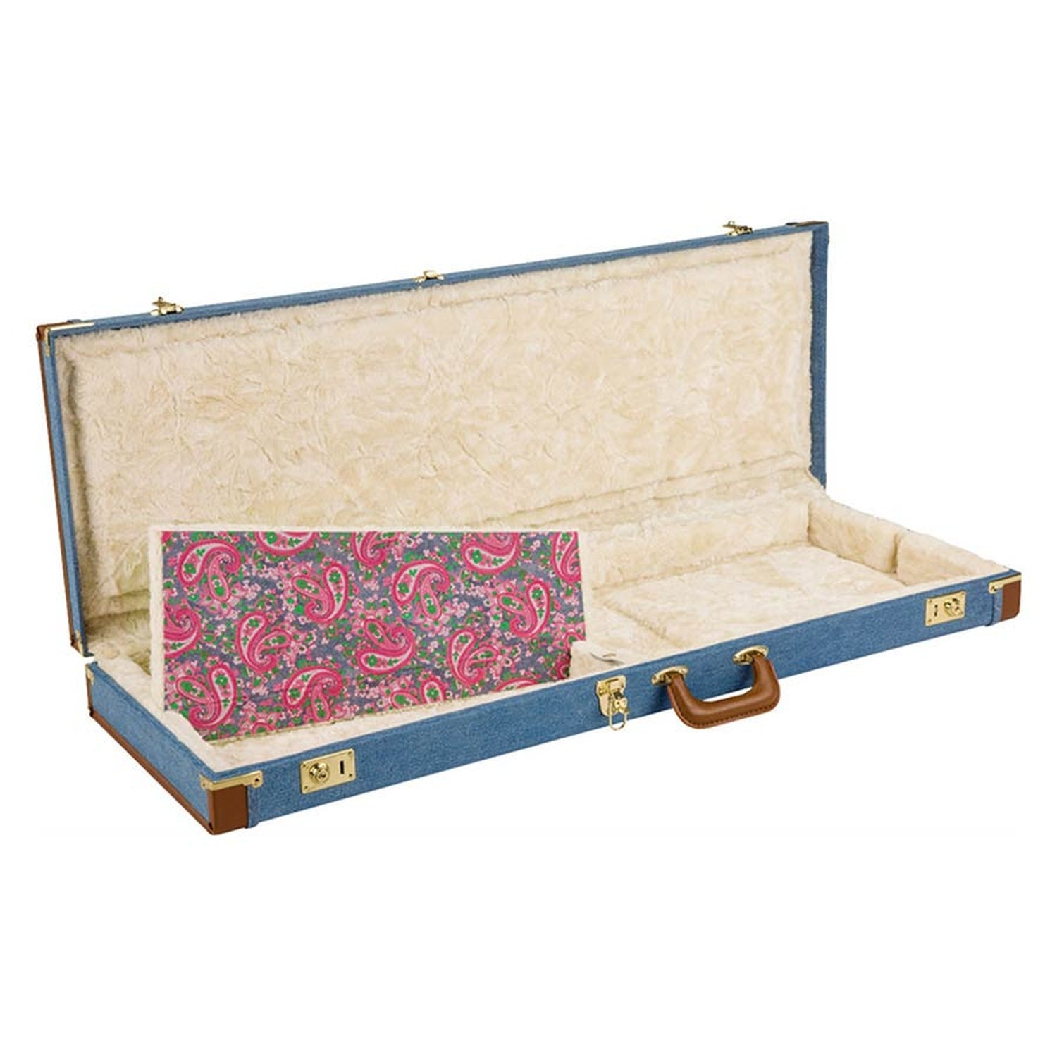 Designed to age and last like your favorite pair of jeans, the Fender© x Wrangler© Denim Case delivers the unmistakable look of Wrangler© with the trusted protection and style you know and love from Fender©. Crafted from durable 3-ply wood, it looks like your everyday Fender suitcase but features unique Wrangler© details. Featuring durable denim, a classic Fender pink paisley-lined accessory compartment, and the iconic 'W' back pocket design, this case will turn heads like your skinniest jeans.
