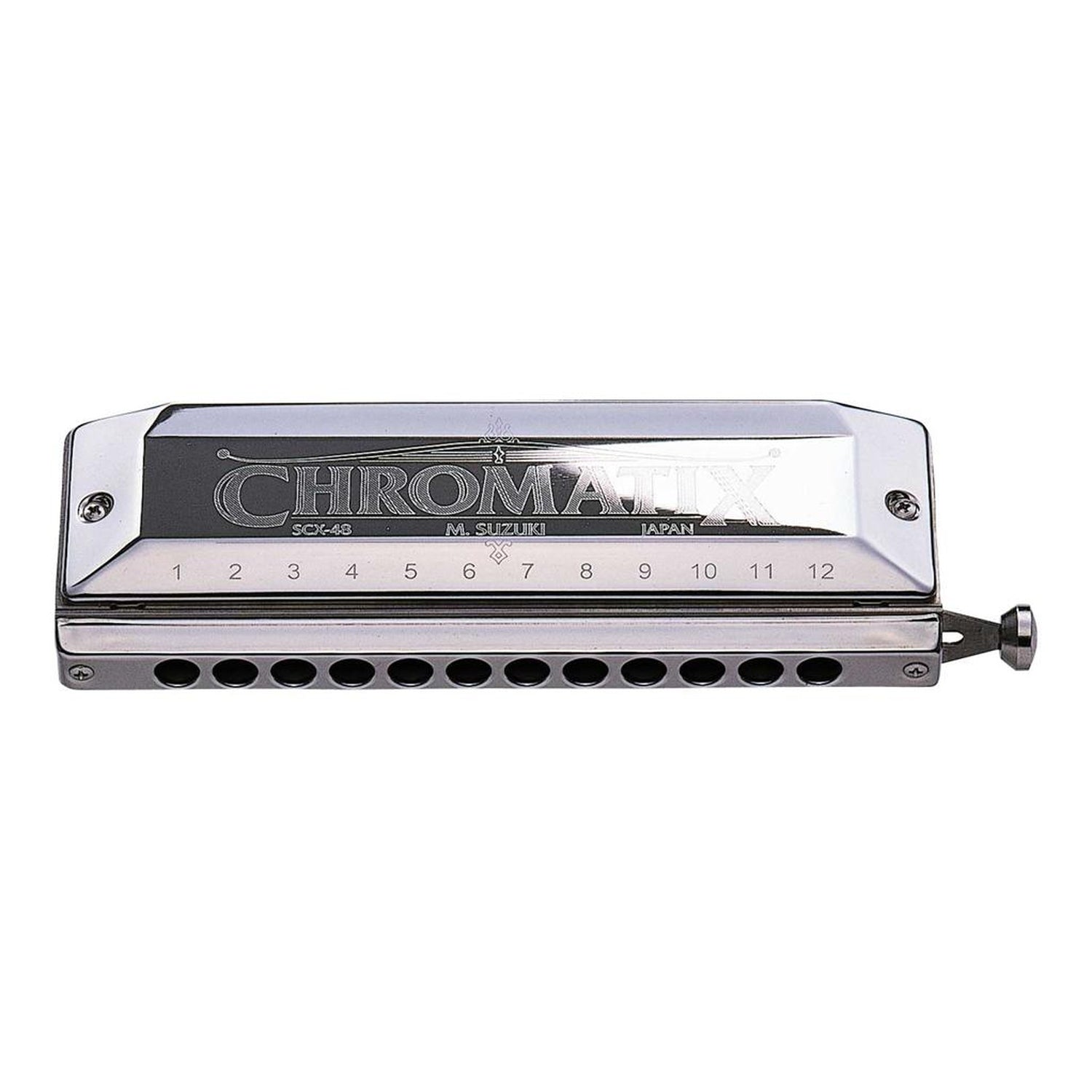 If harmonicas can be described as luxurious, the Suzuki Chromatix series certainly qualifies. These 12-, 14-, and 16-hole harmonicas are beautiful to look at, substantial to hold, and a joy to play. Comfortable and airtight, the Chromatix series is designed specifically for professionals and hand-built by skilled workers . . . one at a time. Features include an ergonomically designed mouthpiece, a precise and smooth slide mechanism, an ABS comb, phosphor bronze reeds, extra-thick brass reed plates, and chrome-plated lids. Exquisite attention to detail makes this the most airtight chromatic ever produced by a major manufacturer. You only need to play a Chromatix once to hear and feel the difference. Their smooth tone production and quick response allow you to advance your playing level beyond what you thought possible. Each Chromatix harmonica is housed in its own luxurious, soft-lined case.