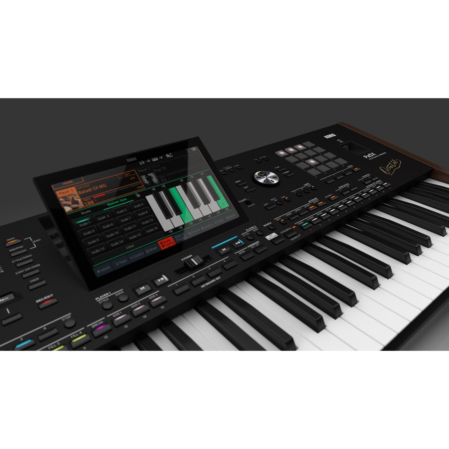 Met de dubbele sequencer speel en mix je twee styles, midi of mp3 bestanden tegelijk. Smooth Sound Transition voorkomt dat noten of effecten wegvallen bij het wisselen. Via het touchscreen gebruik je het virtuele klavier om toonladders aan te passen of afzonderlijke noten direct te stemmen. Je kunt verschillende toonladders tegelijk gebruiken, bijvoorbeeld een Arabische solostem met gelijkzwevende begeleiding. Met harmonizer, autopitch, gitaaringang en een uitgebreide mixer bouw je een complete performance setup.
