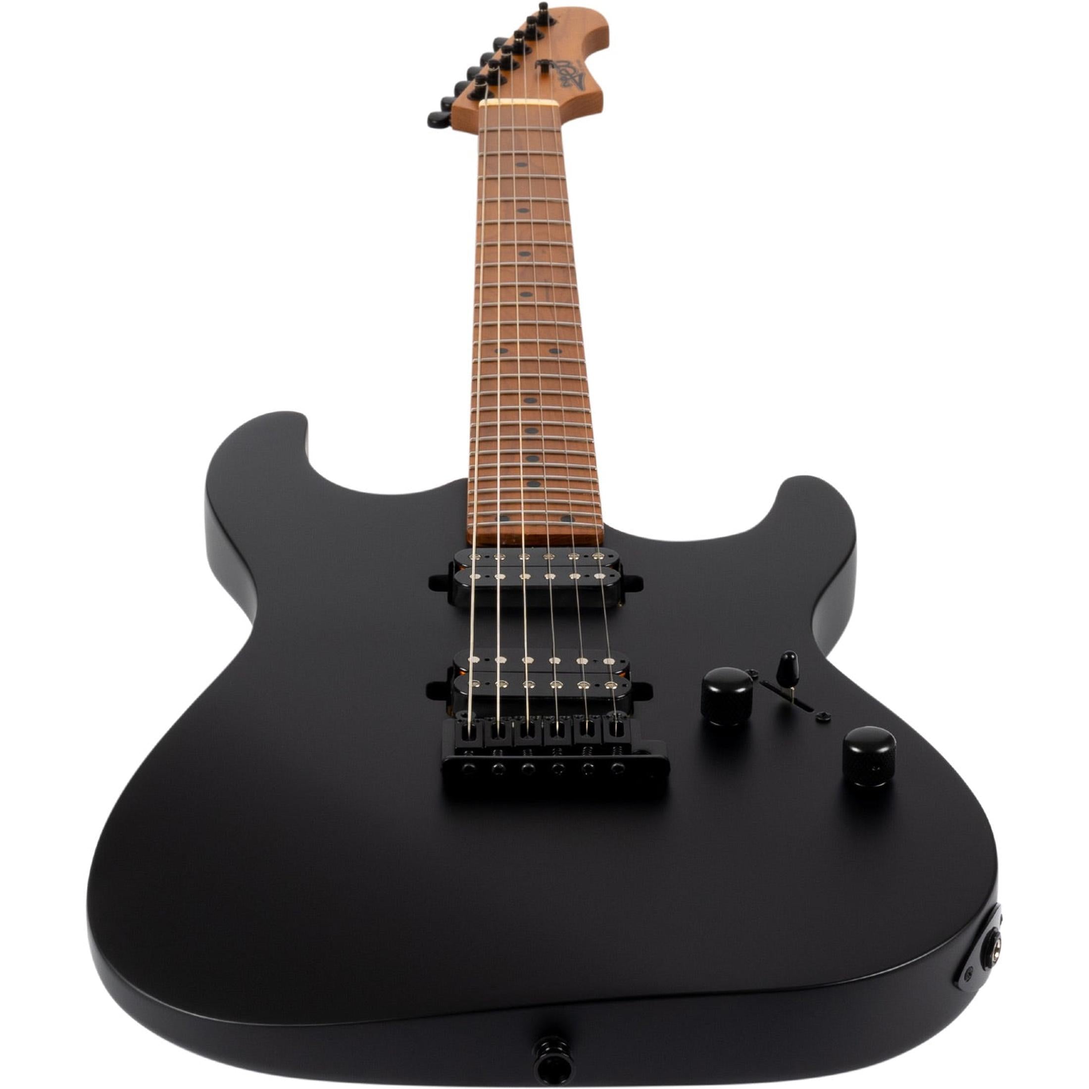 The two Alnico humbuckers are direct-mounted into the body for a direct response and a powerful tone. The 3-way switch allows you to easily toggle between bridge, neck, and combined positions. The Wilkinson tremolo enables vibrato, and the locking tuners help maintain stable tuning. The black hardware and satin black finish give the guitar a modern and aggressive appearance.