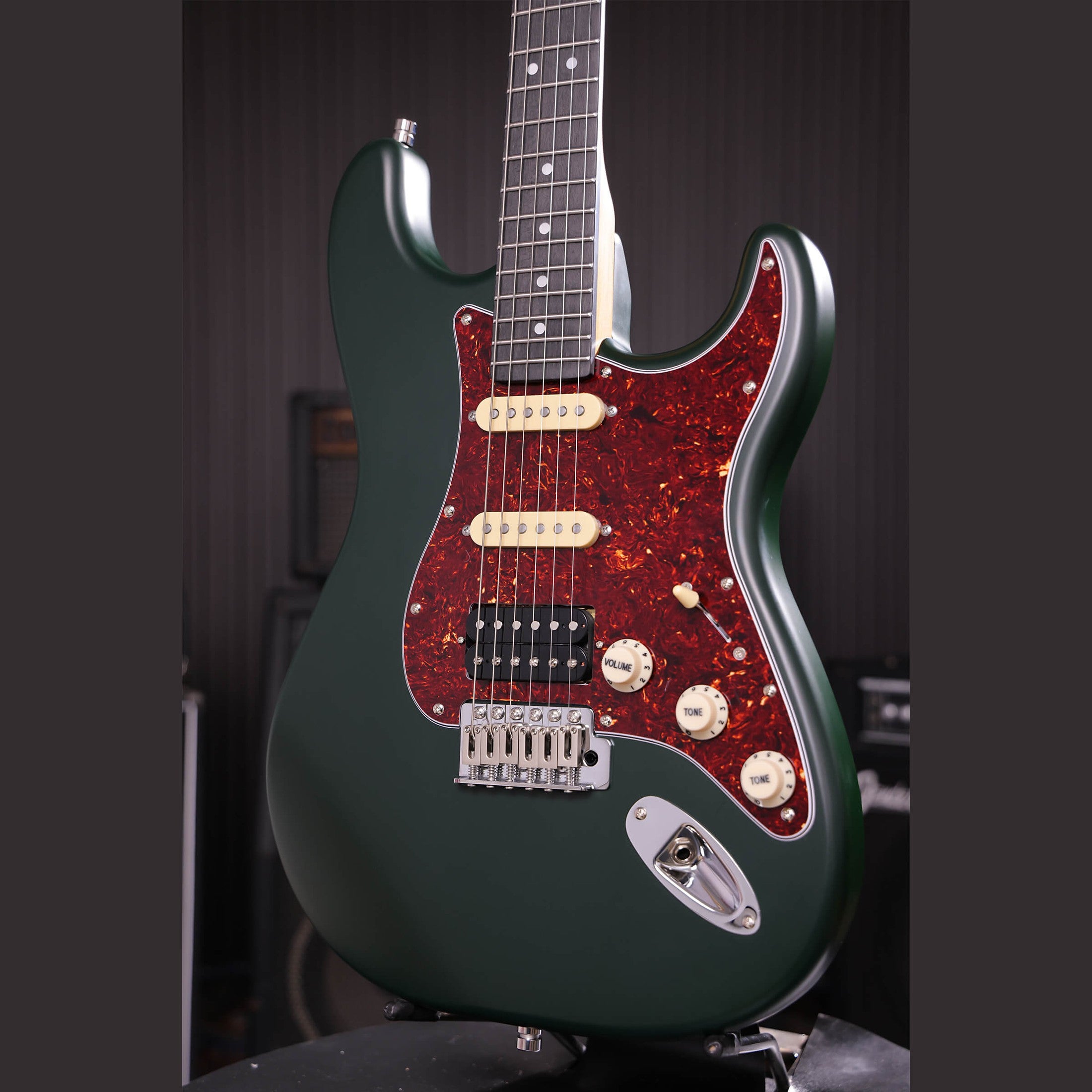 The Patina PS-4 SGR is an S-style electric guitar with a HSS pickup configuration suitable for many playing styles. The single-coil pickups in the neck and middle positions deliver bright tones with clear articulation. The humbucker in the bridge position provides increased output and a tighter response when overdriven.