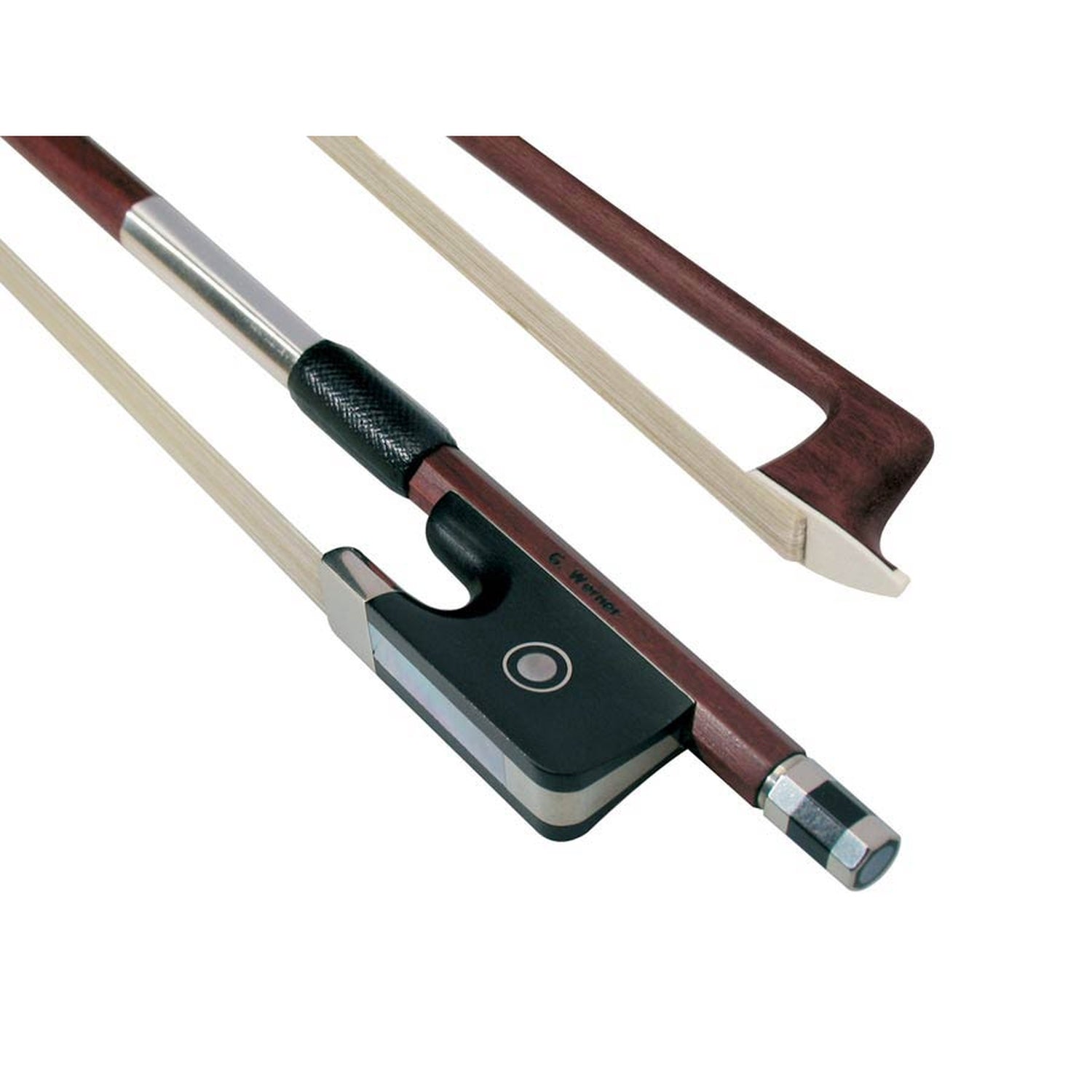 The bow has an elegant curve and is fitted with an ebony frog with a heel plate and a Parisian eye, providing a refined finish and a comfortable grip. The three-piece button with eye completes the design and contributes to the bow's longevity. The high-quality metal winding further enhances its durability.