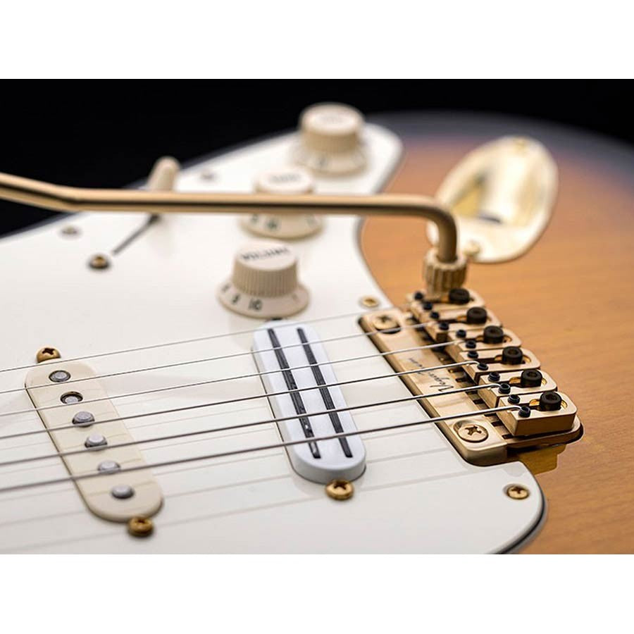 The VegaTrem VT1-2/SG is an advanced 2-point ultra tremolo system for ST-style guitars, crafted from luxurious gold-tone stainless steel. This innovative system offers exceptional tremolo range—both up and down—while maintaining tuning stability, tone, and sustain. The bridge combines a floating and fixed element, connected via a knife-edge joint, resulting in a smooth and responsive action without unwanted noise.