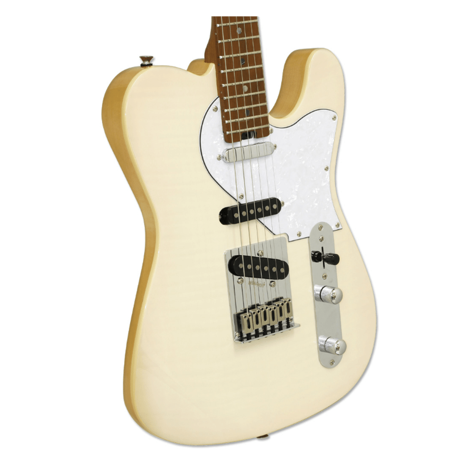 De Aria 615-MK2 - Nashville - is een gitaar die indrukwekkende looks combineert met uitmuntende speelbaarheid en veelzijdige klankopties. De body van populierenhout met een flamed maple top geeft deze gitaar niet alleen een prachtig uiterlijk, maar ook een gebalanceerde, resonante klank. De hals van geroosterd esdoorn met een innovatieve heel-less bolt-on constructie biedt soepel spelcomfort en gemakkelijke toegang tot de hoge frets. De geroosterde esdoorn toets draagt bij aan een consistent speelgevoel met een radius van 240R (9,5″) voor precisie en veelzijdigheid.