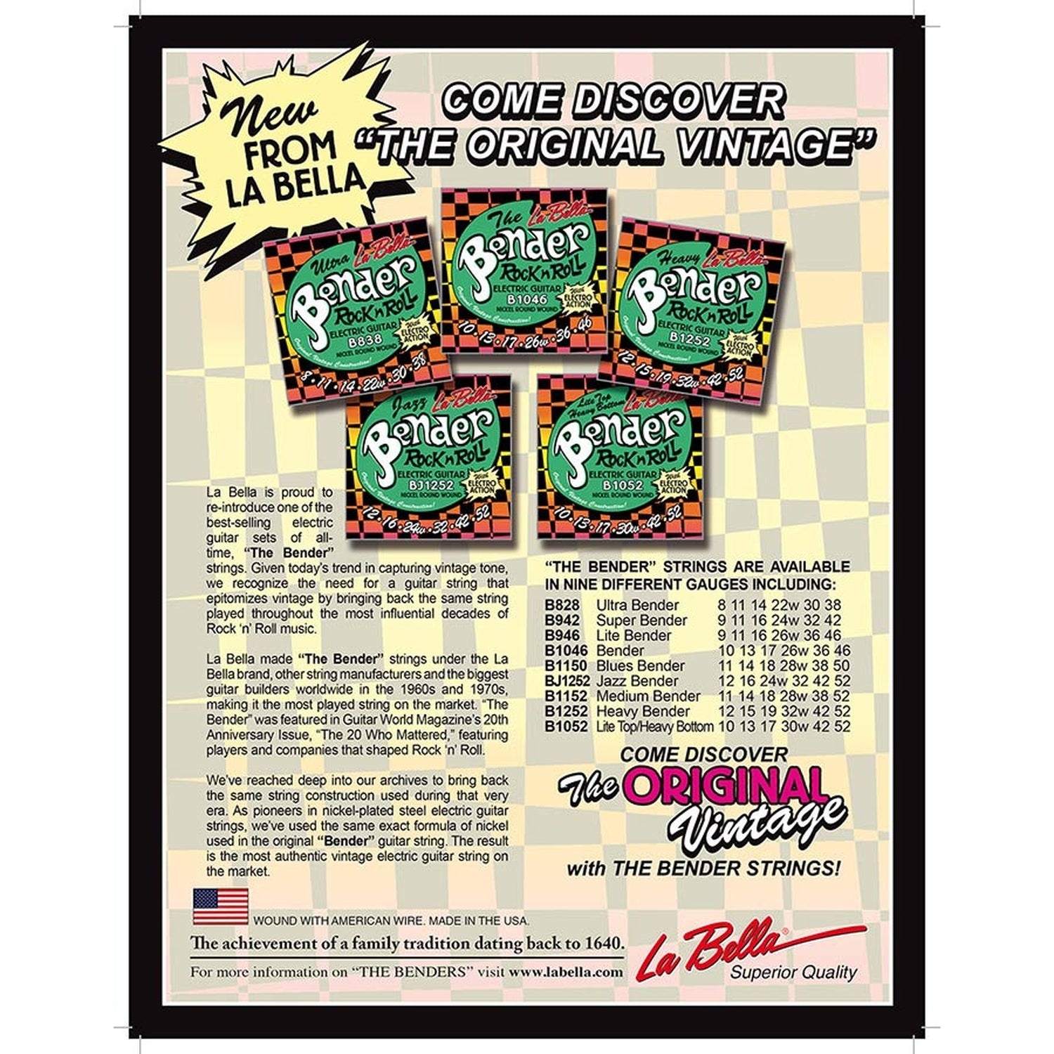 La Bella L-B942 Bender is een elektrische snarenset met een extra light (super light) spanning, ontworpen voor gitaristen die soepel speelcomfort willen combineren met een authentieke vintage toon. Deze snaren zijn vervaardigd volgens La Bella’s originele nickel-plated steel formule uit de jaren 60, en brengen de warme, rijke klank terug die kenmerkend was voor de meest invloedrijke decennia van rock-’n-roll.