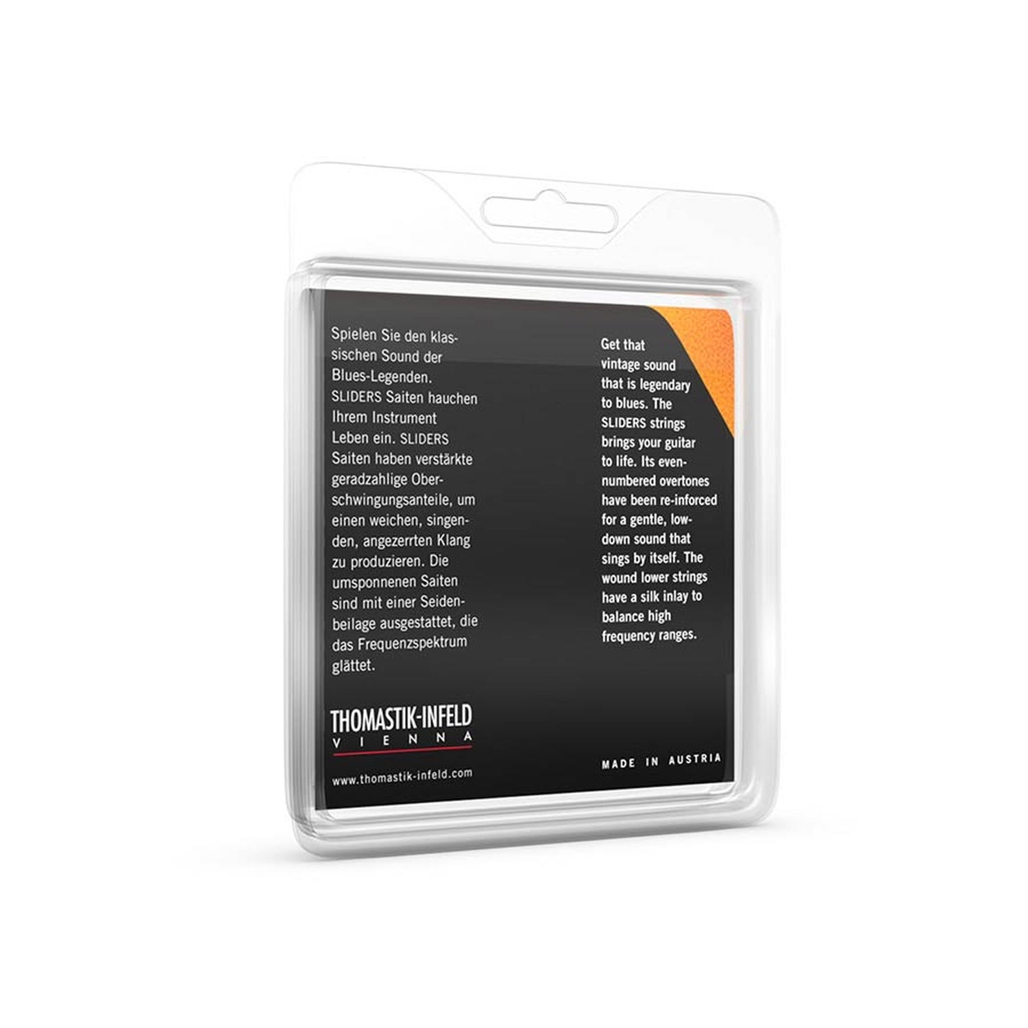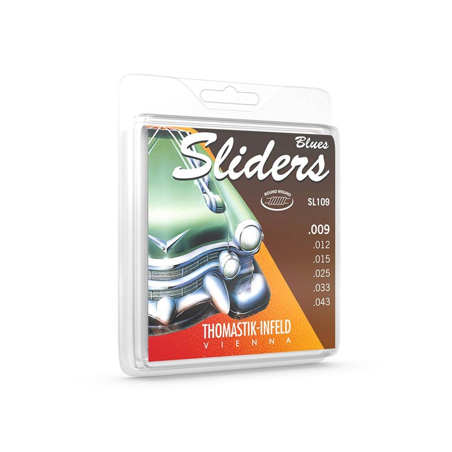 Thomastik Infeld THSL-109 snaren set, round wound, silk inlay, 009-012-015-025-033-043 Round wound nickel with a silk inlay (E,A,D) for a big “round” tone. Even-order harmonics are reinforced for a smooth, velvety sound reminiscent of vintage elektrisch blues and R&B. Overdrive your amp a little and listen to them sing! BLUES SLIDERS are also perfect for classic rock, rocka billy and country.