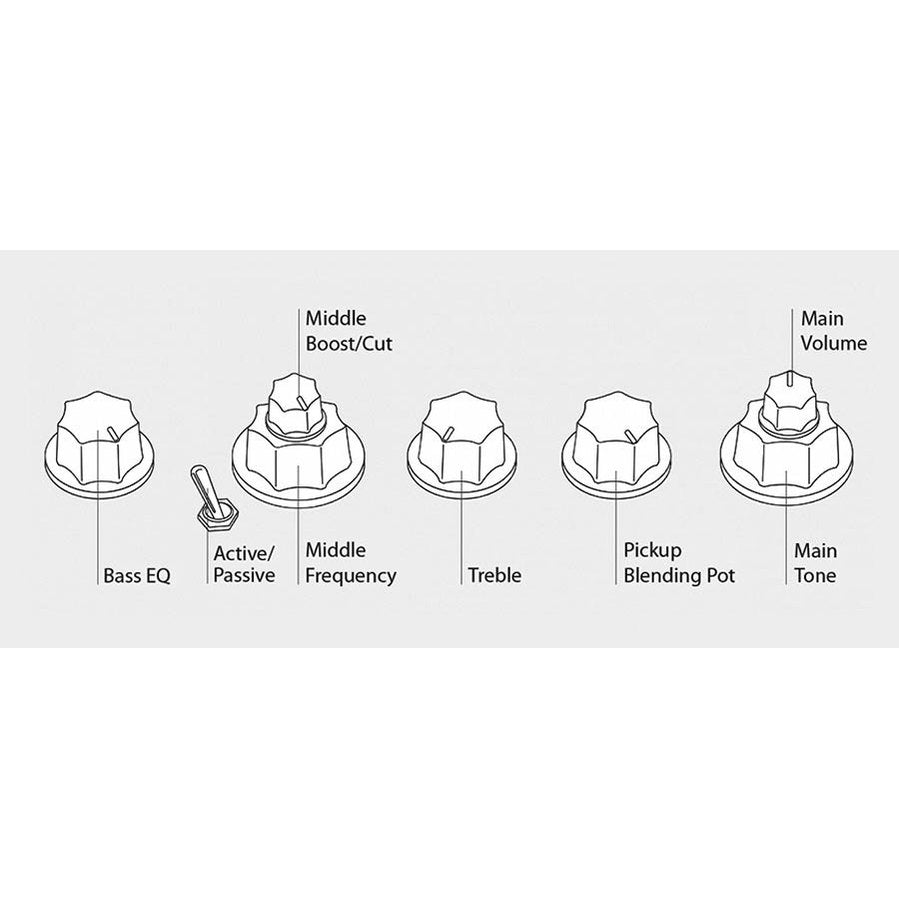 • Regelingen: Volume/tone (dual pot), pickup blender, treble, mid/mid freq (dual pot), bass, mini toggle (actief/passief)