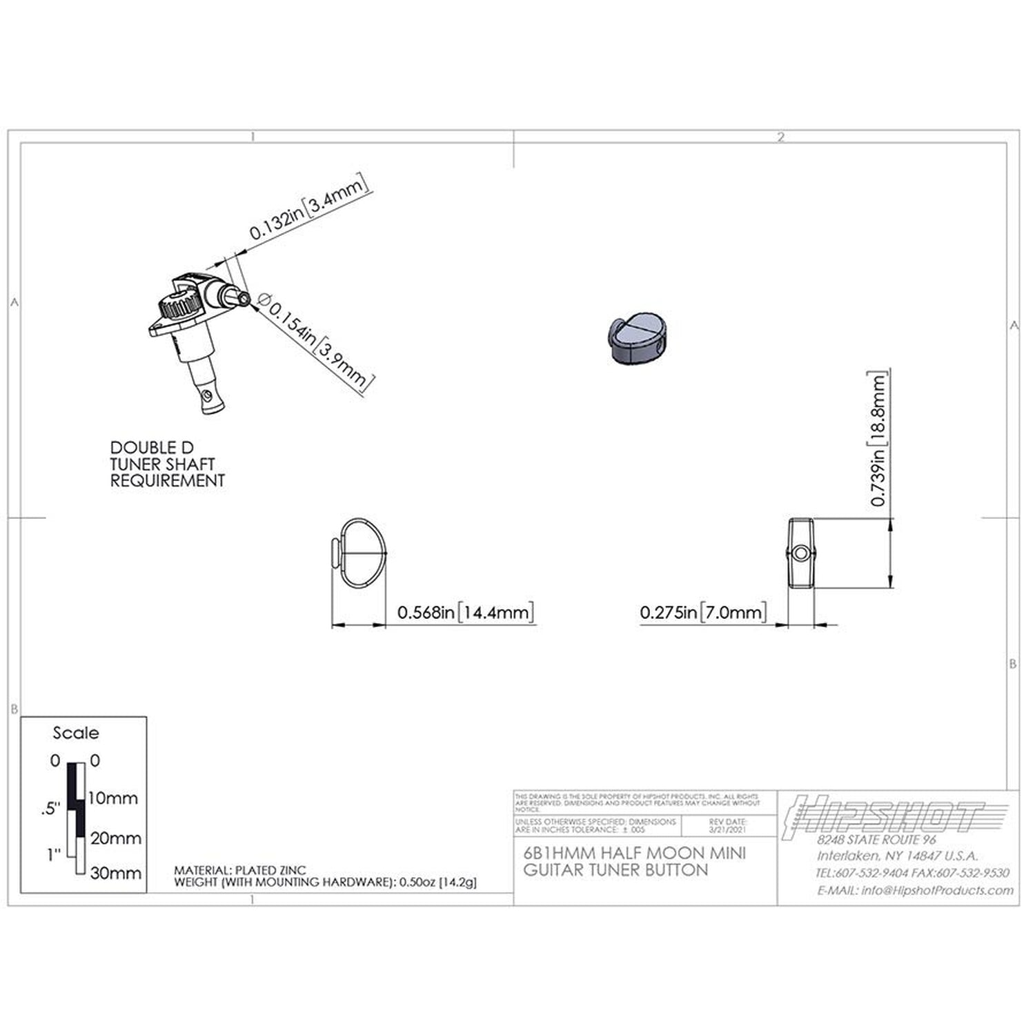 Hipshot HS6B1HMMN half moon mini guitar tuner button, nickel