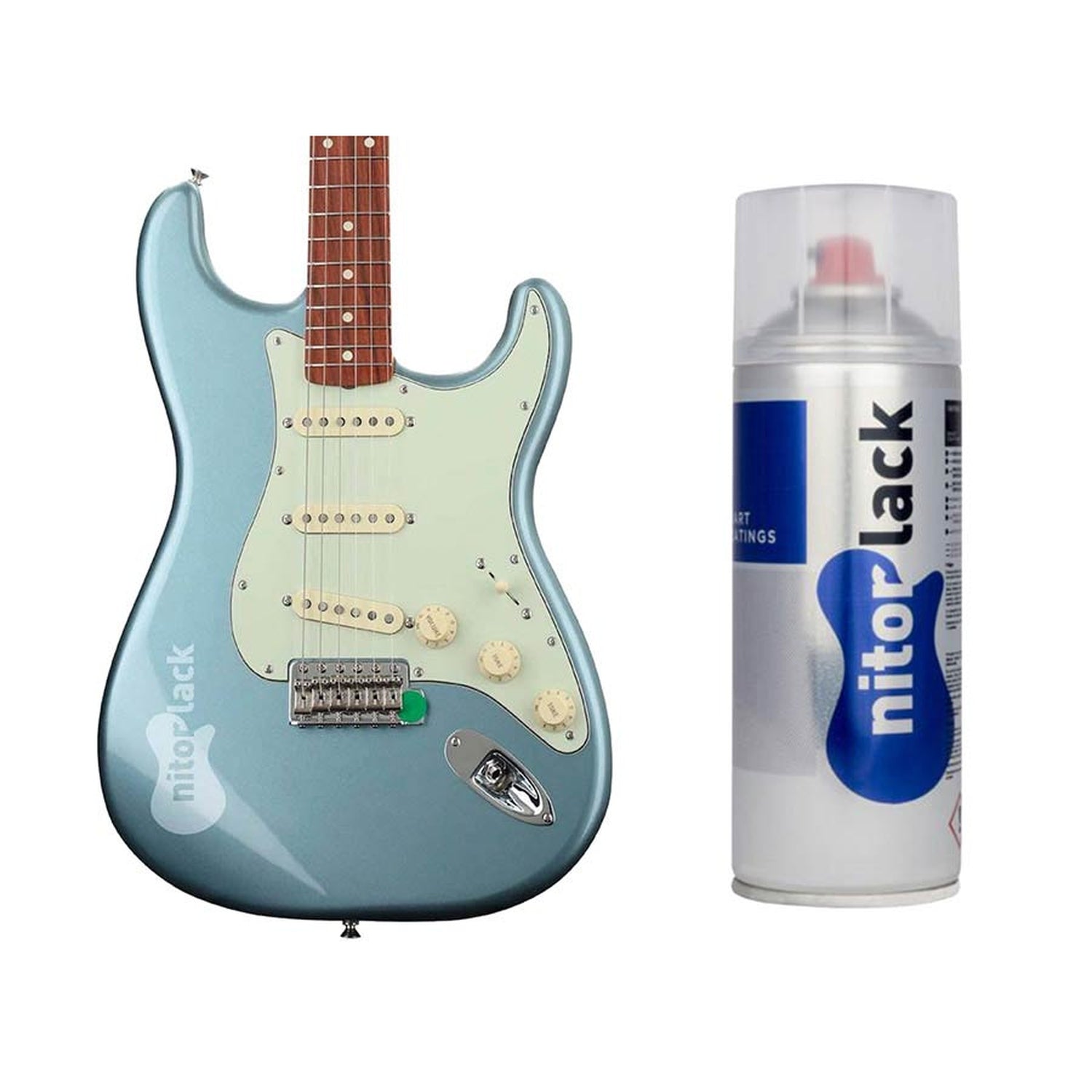 De NitorLACK N250794160 is een nitrocellulose lak in spuitbusformaat van 400ml, uitgevoerd in de exclusieve kleur Blue Ice Metallic. Deze zeldzame Fender custom colour werd in de jaren '60 beperkt toegepast op Telecasters, Jazzmasters en enkele Stratocasters. De kleur is een koele ijsblauwe metallic tint die na verloop van tijd een groenige gloed krijgt door natuurlijke veroudering van de nitrolak – een effect dat je ook direct kunt bereiken met een amberkleurige transparante afwerklaag.