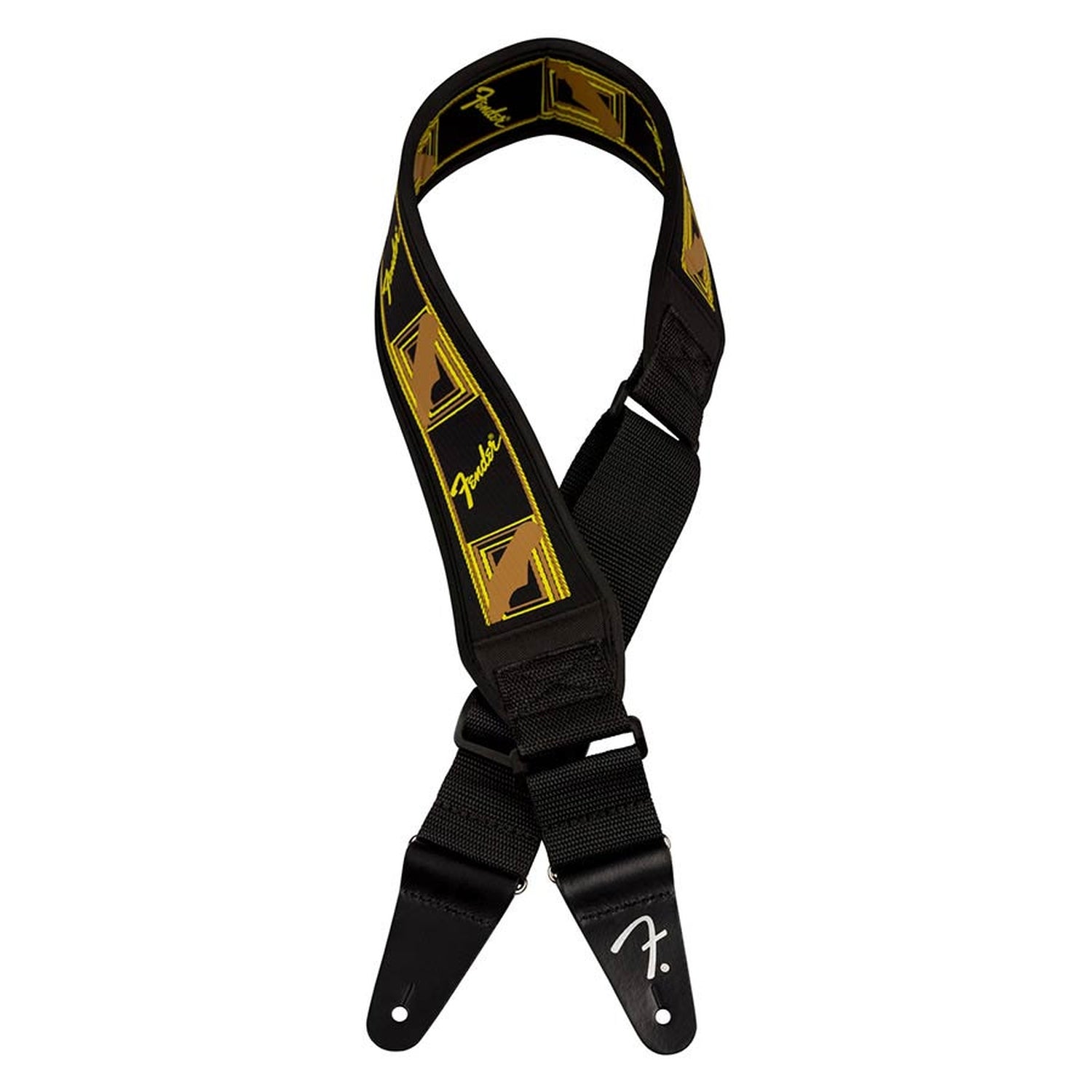 Fender 990694208 Swell neopreen gitaarband, zwart/geel/bruin mono, 2.5" Designed for maximum comfort, the Fender® Neoprene strap is perfect for enduring long practices and performances. The large neoprene pad alleviates weight off your back and shoulders while providing heat relief through its mesh construction. Extra reinforced pads on the end tabs ensure long-lasting durability for use with heavier instruments.
