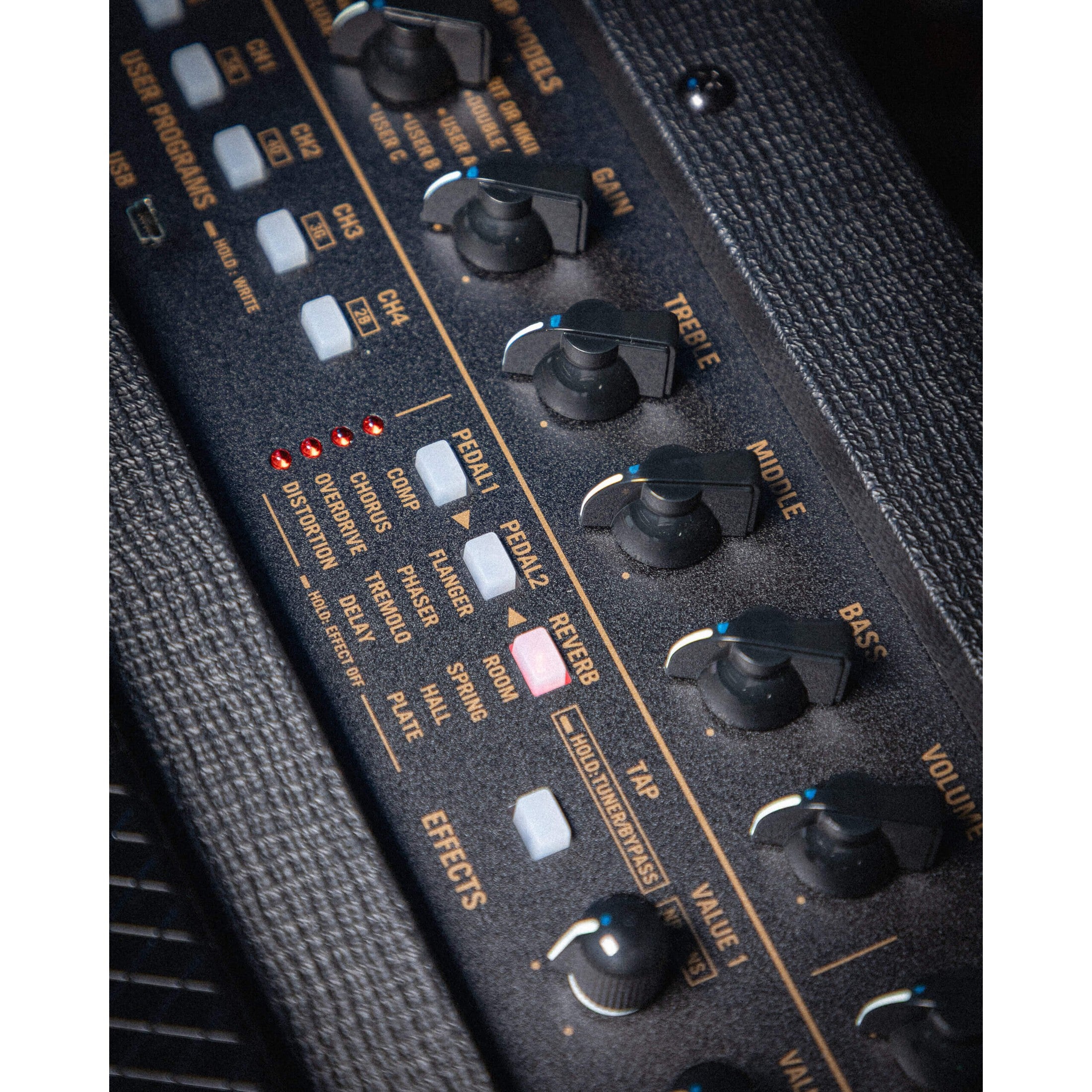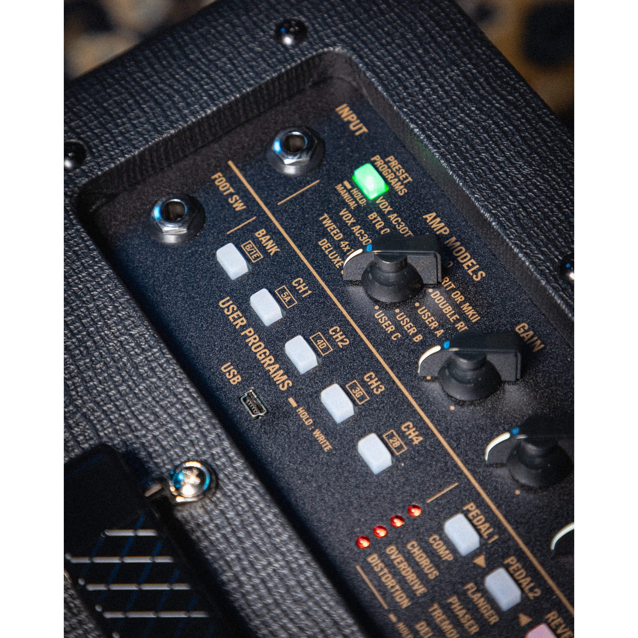 - Selectie: Amp model selector, 5 user presets, 3 effect selectors