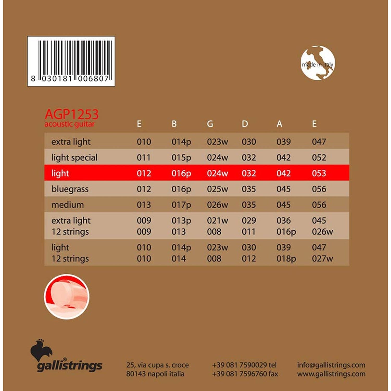 Galli AGP1253 snaren set acoustic, phosphor bronze wound, light, 012-053 The maximum duration of the snaars is guaranteed by an imperceptible film of polyurethane which covers only the wrapping, protecting it from premature wear and tear.