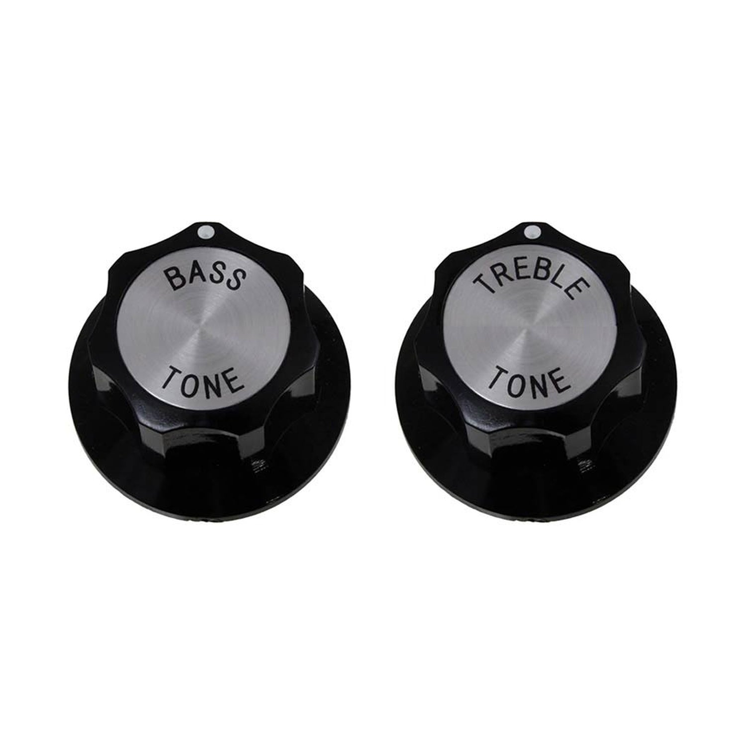 Set van twee toonknoppen voor Rickenbacker® (Bass/Treble) met zilveren top, zwart. Perfect voor het upgraden van je instrument en het verbeteren van je geluidsregeling. Voeg stijl en functionaliteit toe aan je gitaar met deze hoogwaardige knoppen.
