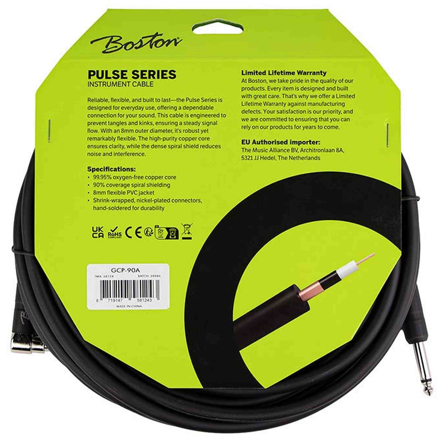 De Boston GCP-90A uit de Pulse Series is een 9 meter lange instrumentkabel met een rechte jack aan de ene kant en een haakse jack aan de andere. Deze kabel is ideaal voor livegebruik waar je veel bewegingsruimte nodig hebt en toch een nette aansluiting op je instrument of pedalboard wilt houden. De flexibele mantel voorkomt knikken en kabelbreuk.