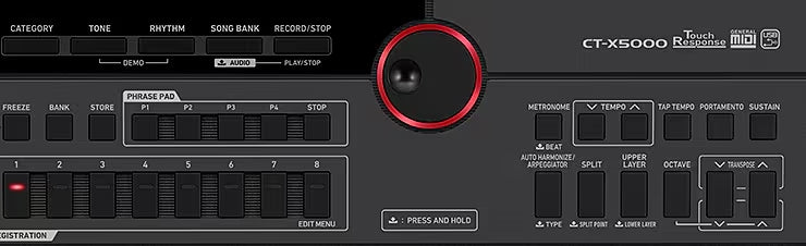 Het keyboard beschikt over 61 aanslaggevoelige toetsen en biedt ondersteuning voor laag- en splitspeelmodi. Dankzij aansluitmogelijkheden zoals USB, Audio In, Line Out en pedaling input, integreert het moeiteloos in elke studio- of live-setup. Met de bijgeleverde adapter, een breed scala aan ingebouwde functies, en ondersteuning voor SMF- en audiobestanden via USB-stick is de CT-X5000 een uiterst compleet en professioneel instrument voor elke toetsenist.