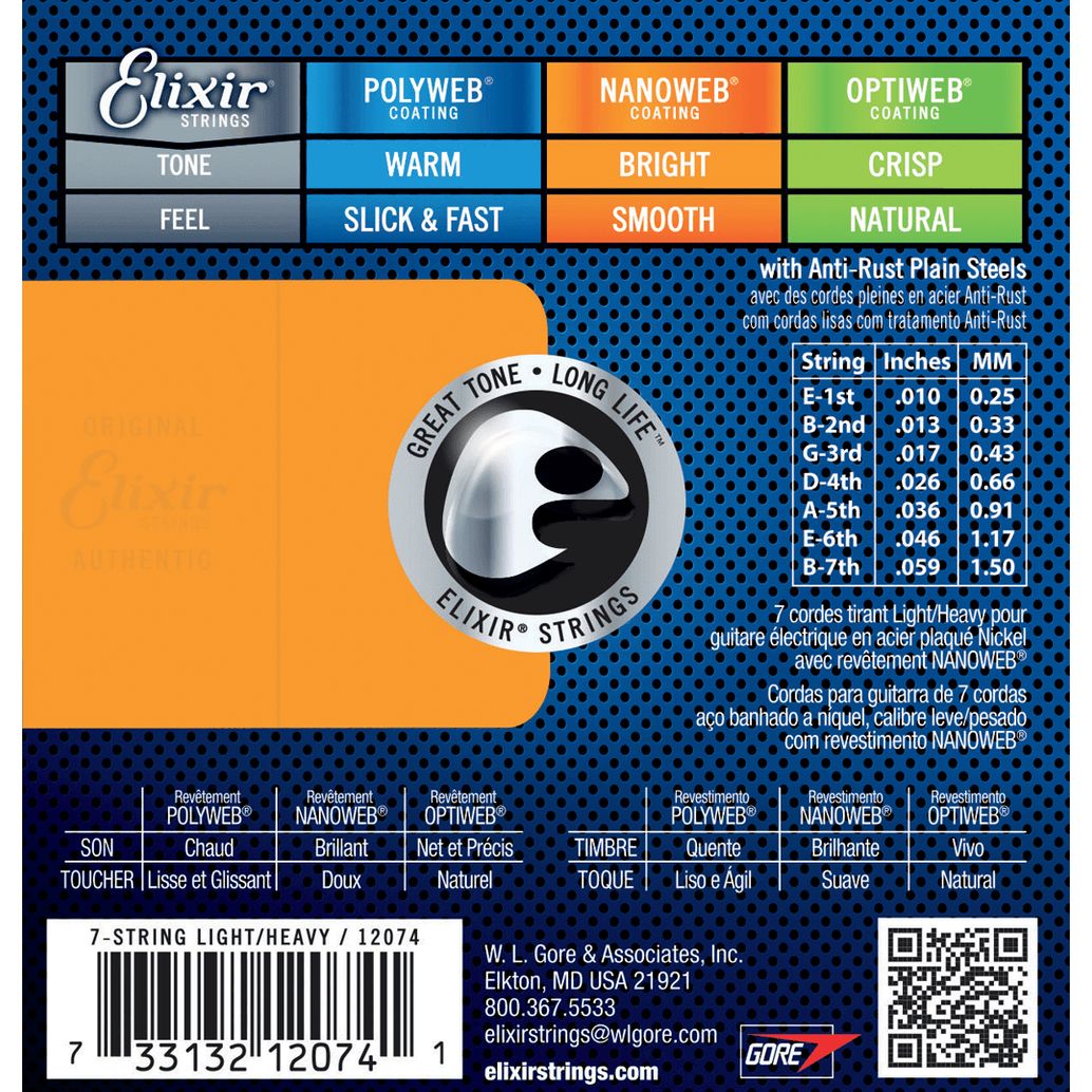 De Elixir 12074 is een set elektrische gitaarsnaren voor 7-snarige gitaren in Light Heavy uitvoering (010-059), ideaal voor gitaristen die lichte bovensnaren wensen voor soepel solowerk, gecombineerd met dikkere lage snaren voor krachtige ritmepartijen en stabiliteit in lage stemmingen. Dankzij de NANOWEB® coating blijven de snaren helder klinken en gaan ze tot 3 tot 5 keer langer mee dan ongecoate snaren, zonder in te leveren op speelgevoel.
