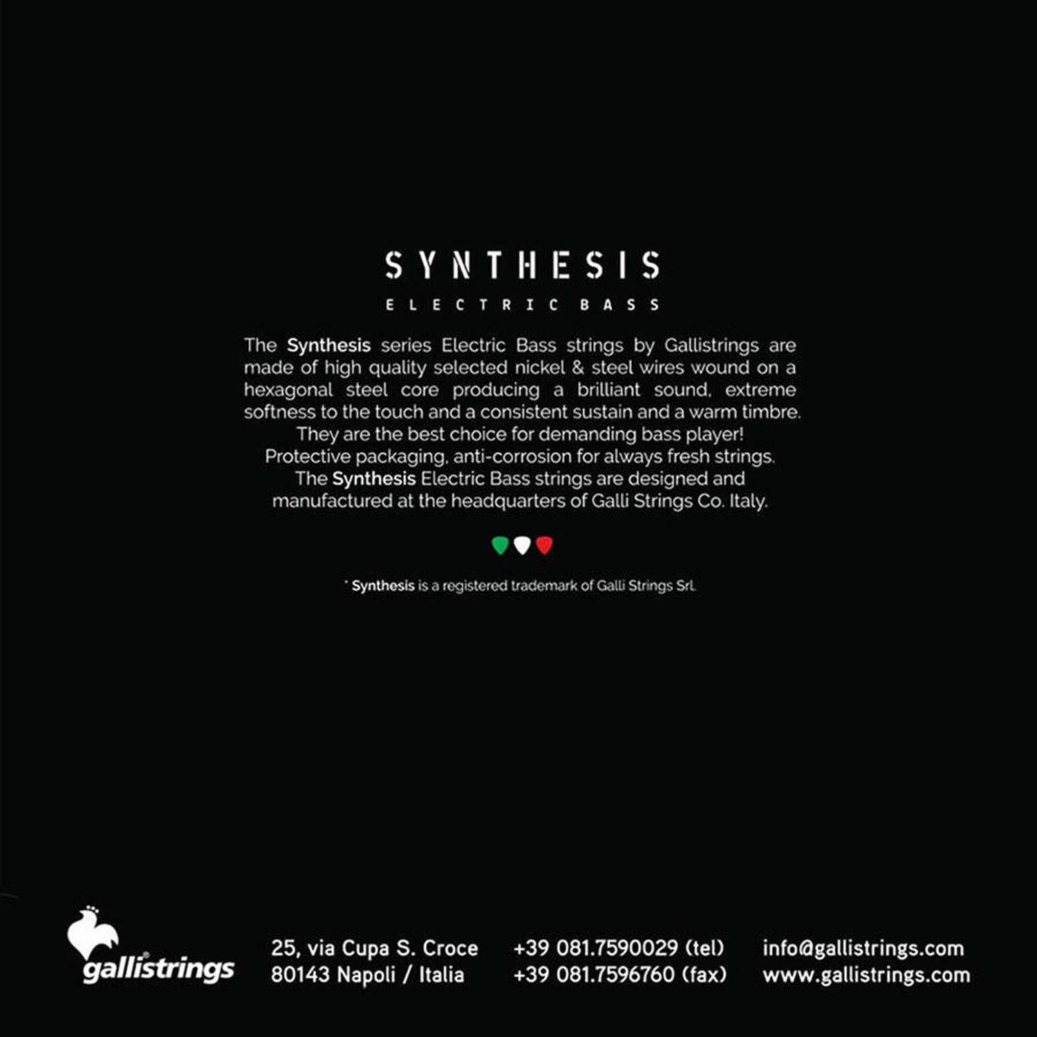 Galli BSN-45130 5-snaren set elektrisch bass, nickel and steel double winding, med custom tapered, 045-065-085-105-13 The Synthesis series elektrisch Bass snaars are made of high quality selected nickel & steel wire wound on a hexagonal steel core producing a brilliant sound, extreme softness to the touch and a consistent sustain and a warm timbre. They are the best choice for demanding bass player!