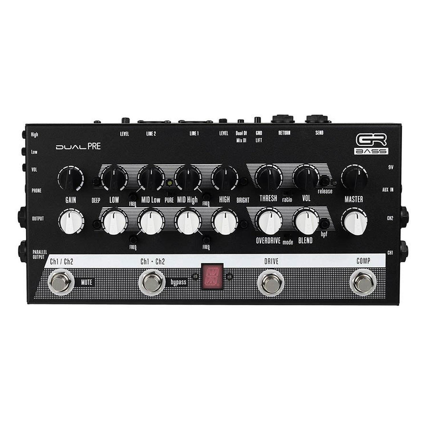 GRBass DUALPRE dubbelkanaals voorversterker pedaal, 4-bands EQ, drive, comp, tuner, DI, koptelefoon, parallelle uitgangen