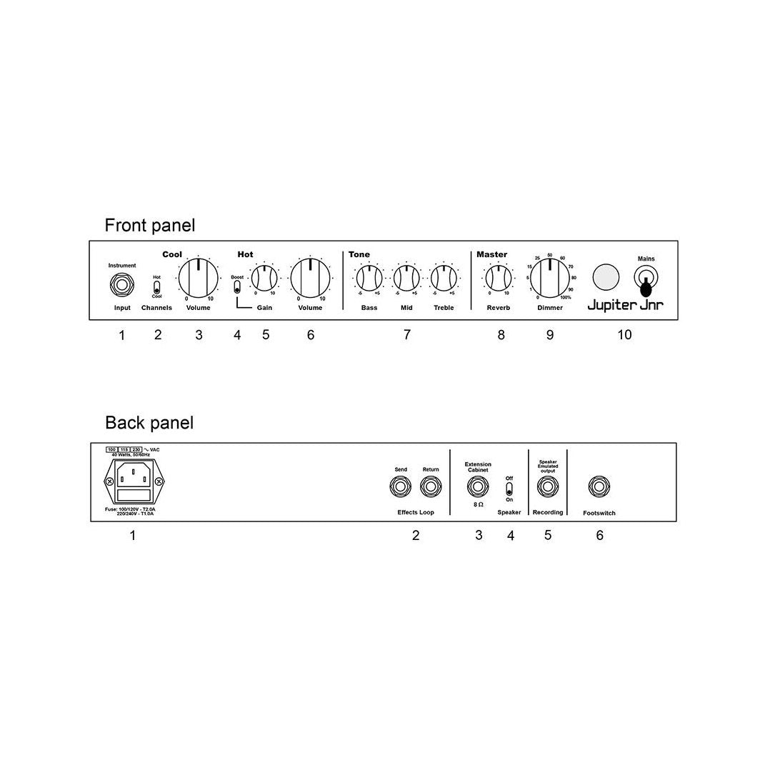 De versterker biedt drie schakelbare kanalen: Cool (clean), Hot (overdrive) en Hot Gain Boost. Elk kanaal heeft een eigen volume- of gainregeling en ze delen een driebands toonregeling. De ingebouwde reverb is gebaseerd op een klassieke spring-emulatie en voegt extra diepte toe aan je sound. Met functies zoals een dimmer (traploos instelbaar van 0 tot 20 watt), een speaker aan/uit-schakelaar en een opname-uitgang met speakeremulatie is de J20 ook perfect voor stil oefenen en studio-opnames.