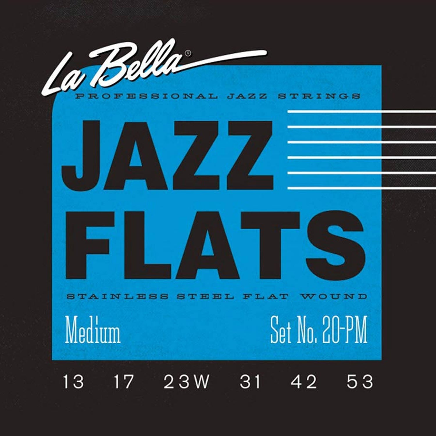 La Bella L-20PM snaren set elektrisch, ribbon wound, medium, 013-017-023w-031w-042-053 Developed in 1940 by La Bella, these snaars were initially manufactured for the original hollow-body jazz guitars and continue to be best-sellers for jazz guitars today. With a high magnetic content for increased electronic output, their smooth surface eliminates finger noise and snaar squeaks. Flat Wound Stainless sets have a very bright sound, a smooth feel and a long playing life.