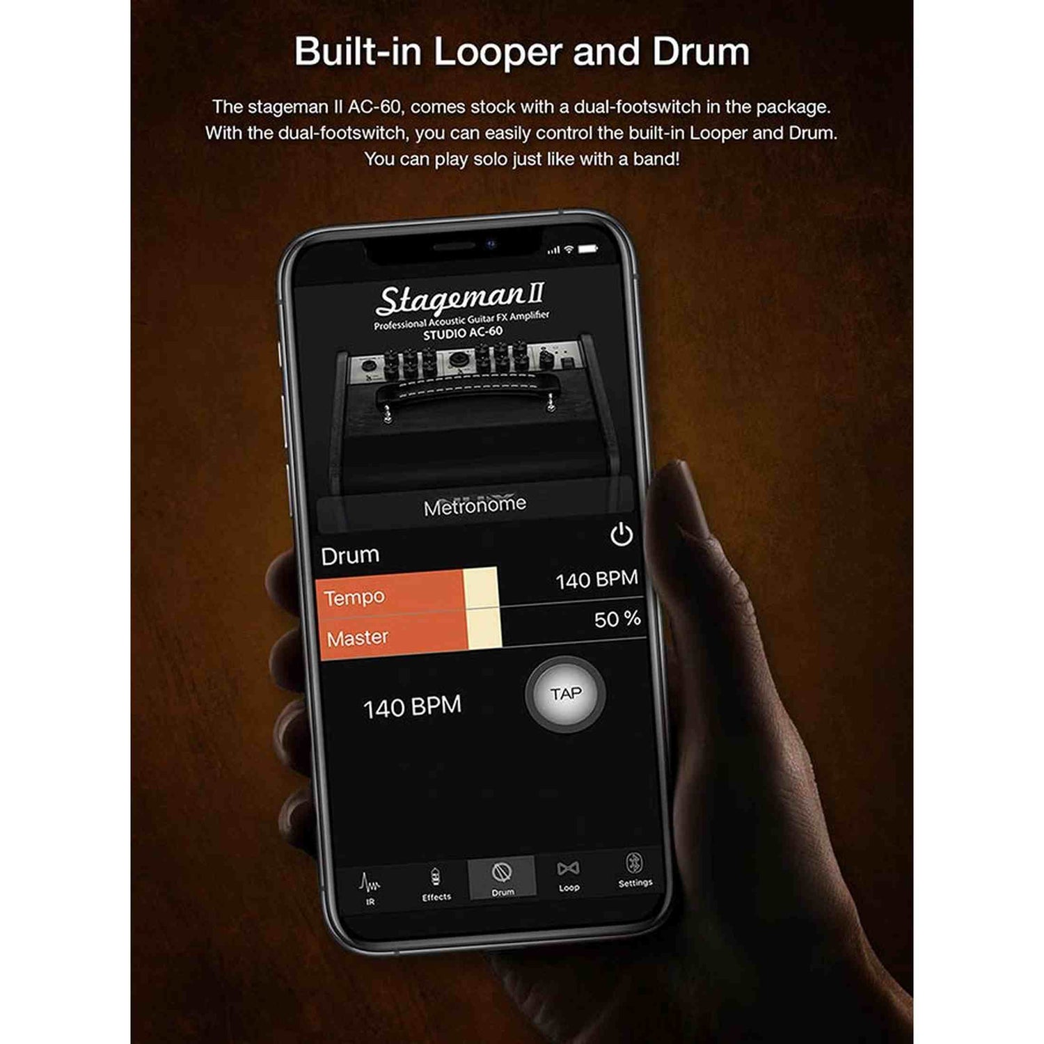 De versterker is geschikt voor live- en opnamesituaties, met XLR DI out, line out en een effect-loop (send/return) om externe effecten toe te voegen. Met Bluetooth en een bijbehorende app stel je de amp eenvoudig op afstand af. Een complete oplossing voor singer-songwriters en solisten die flexibiliteit zoeken in een robuust en mobiel formaat.