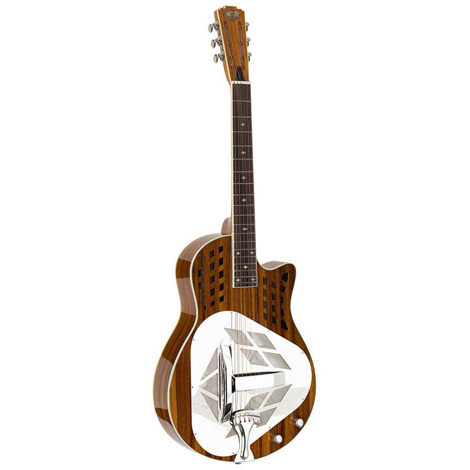 De Royall KOA12US is een 12-fret tricone resonatorgitaar met een body van massief Hawaïaans koa en een ingebouwde undersaddle pickup met volume- en toonregeling. De combinatie van het koa-hout en het tricone-systeem met drie handgesponnen 6" aluminium cones zorgt voor een warme, heldere toon met veel gelaagdheid en sustain. Dankzij de cutaway heb je gemakkelijk toegang tot de hogere frets, ideaal voor expressief slide- of melodisch spel op het podium of in de studio.
