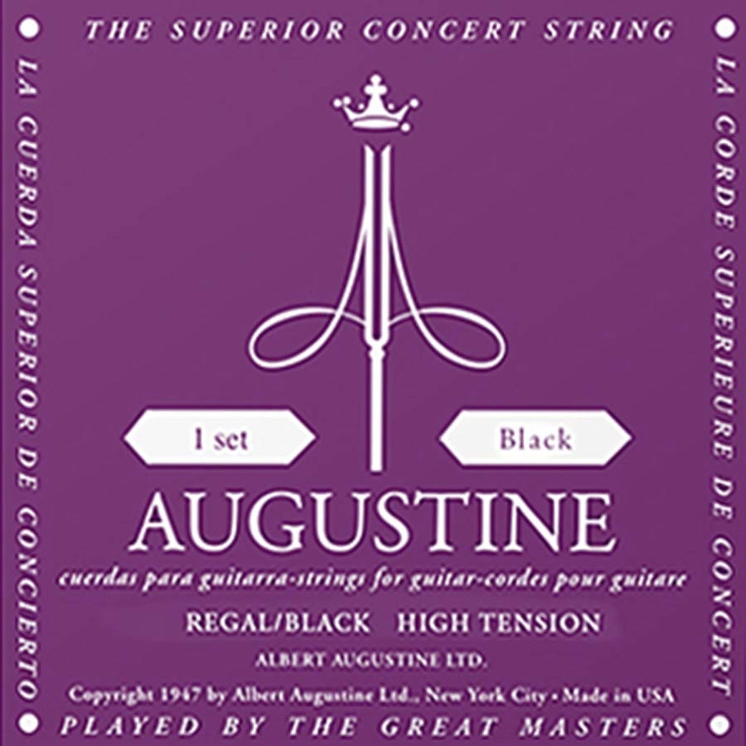Augustine AU-REBK Black string set classic, high tension trebles & light tension basses Danish luthier Albert Augustine moved to the USA in 1926, where he developed the nylon guitar string in cooperation with famous musician Andrés Segovia. UsingDuPont nylon, Augustine perfected the winding and polishing of the bass strings and presented the perfect alternative for catgut strings, that had been used untill then but were very hard to get.