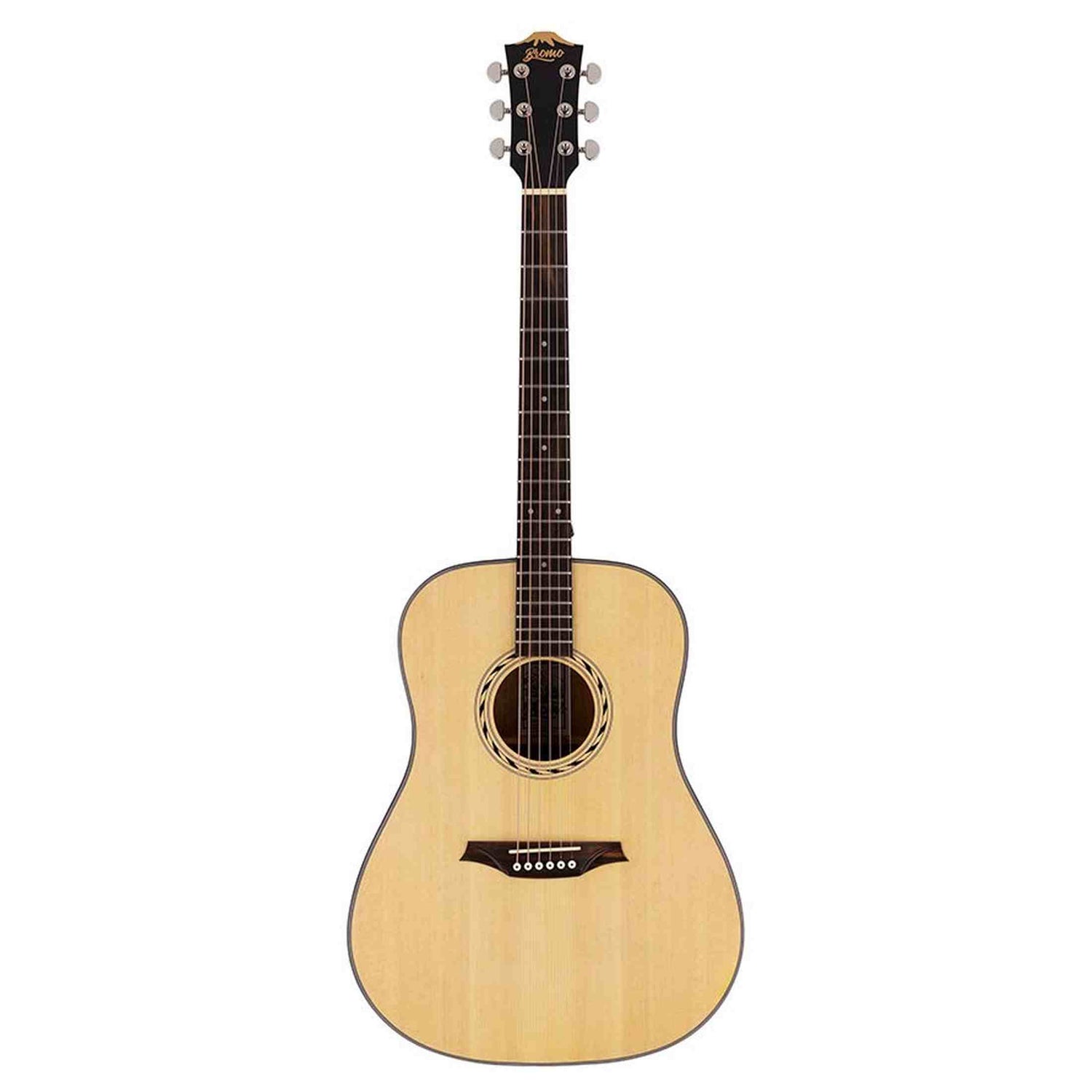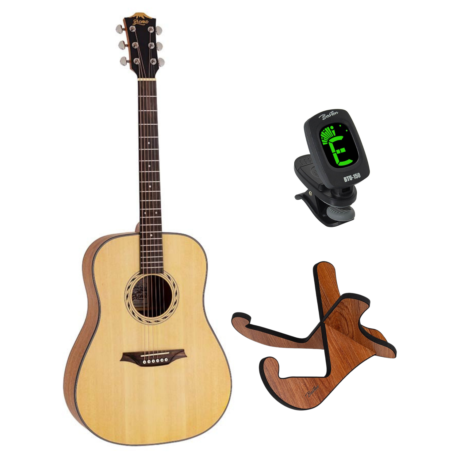 Bromo BAB1 acoustic guitar set – dreadnought, spruce/mahogany, Amara ebony fingerboard, natural + tuner and stand