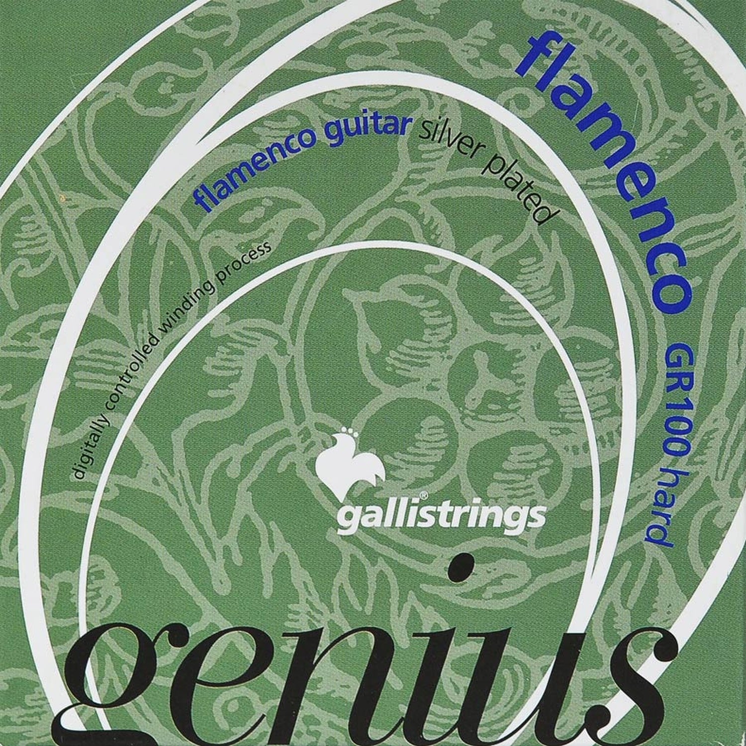 Galli GR-100 string set flamenco, black trebles and silver plated basses, hard tension, 029-033-041-030-038-045 New crystal nylon for the trebles and coated silver plated copper for the basses. Same concept of the Genius but with the special gauges of Flamenco style.