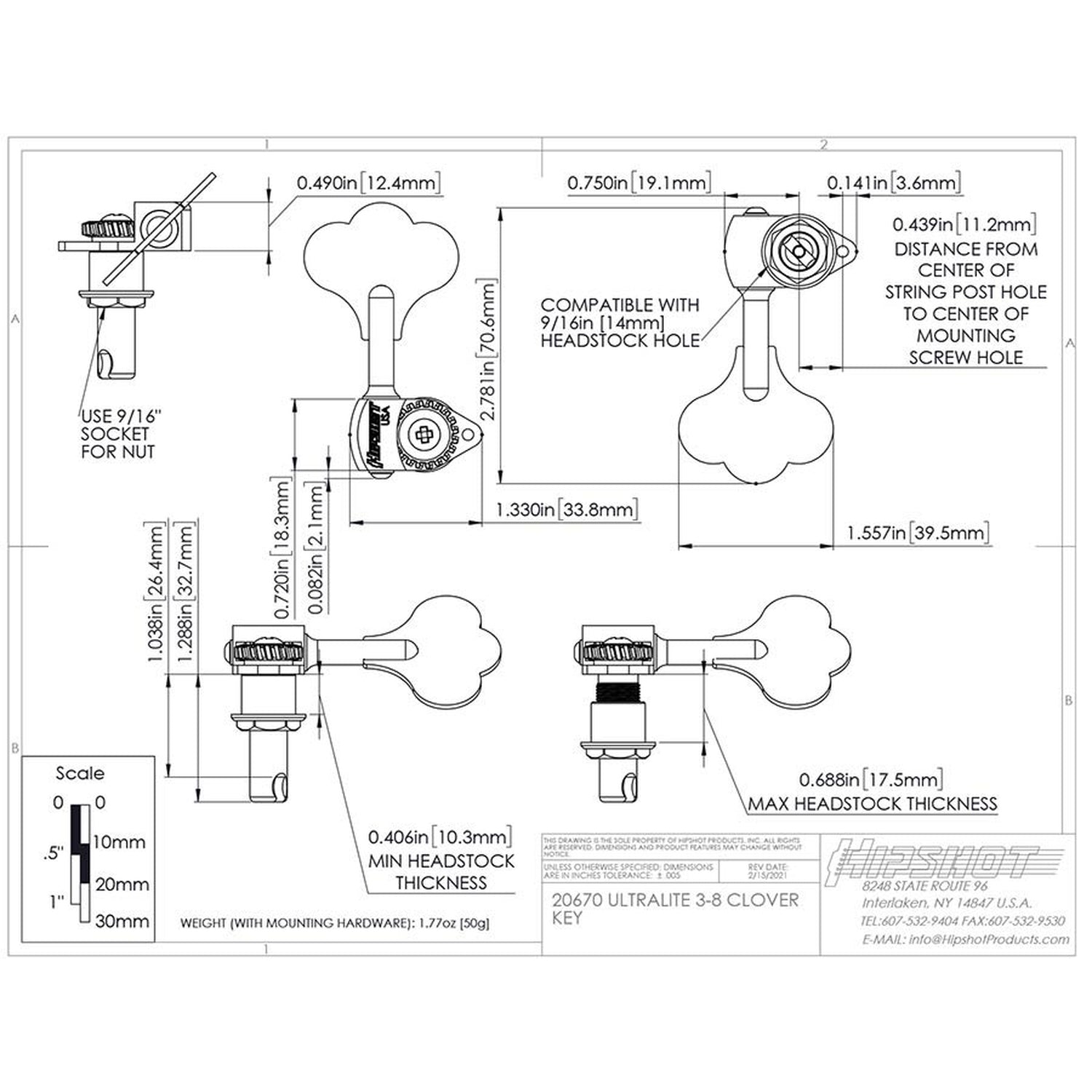Hipshot HS0670C HB6 3/8" USA Ultralite bass tuning machine, chrome, clover key