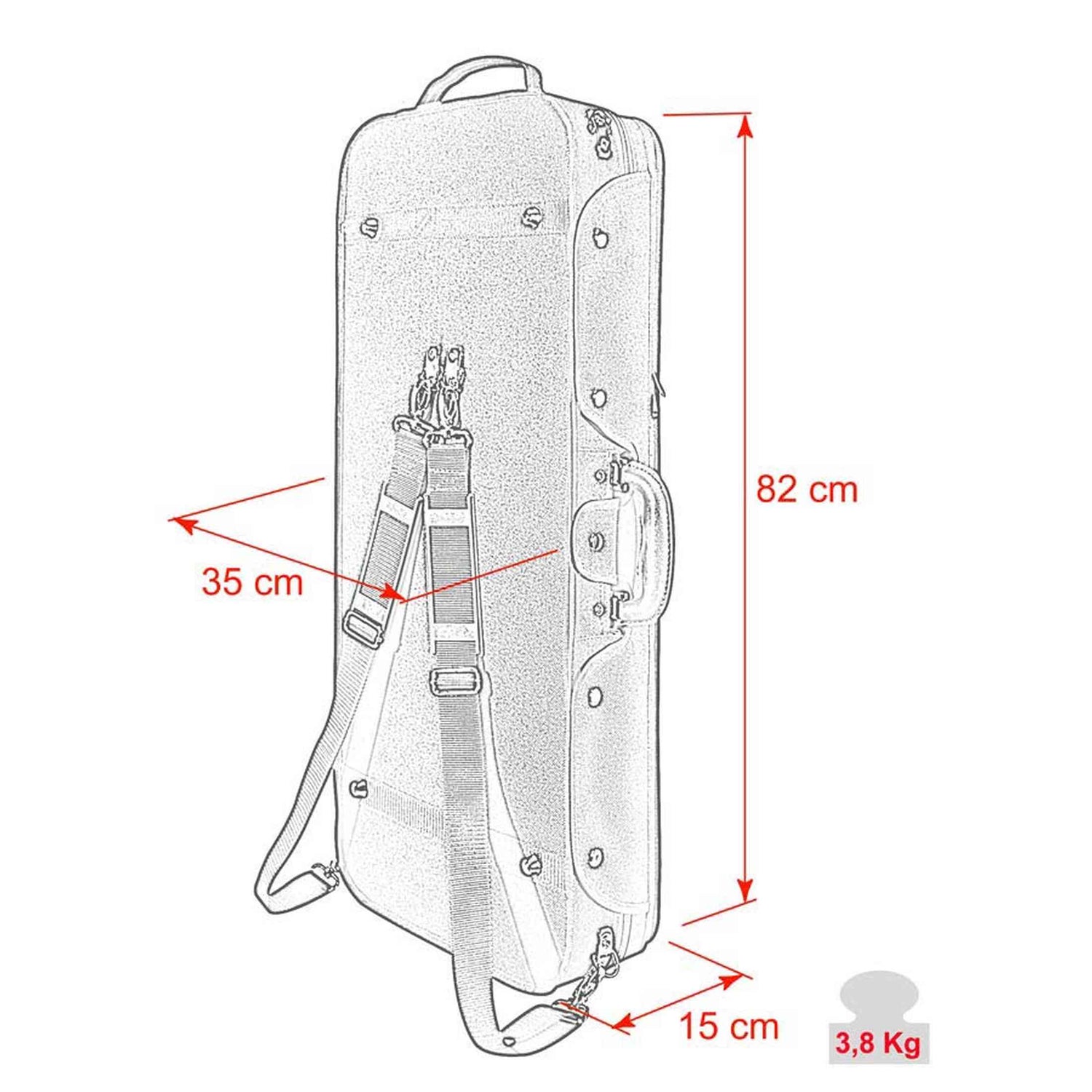 De buitenzijde is uitgevoerd in slijtvast Cordura. De binnenzijde is afgewerkt met rood suède en half gevoerd voor een goede balans tussen bescherming en gewicht. Je neemt tot vier strijkstokken mee en bergt accessoires op in twee interne vakken. Met twee rugriemen draag je de koffer comfortabel. De beschermdoek voorkomt direct contact tussen de violen en de deksel.