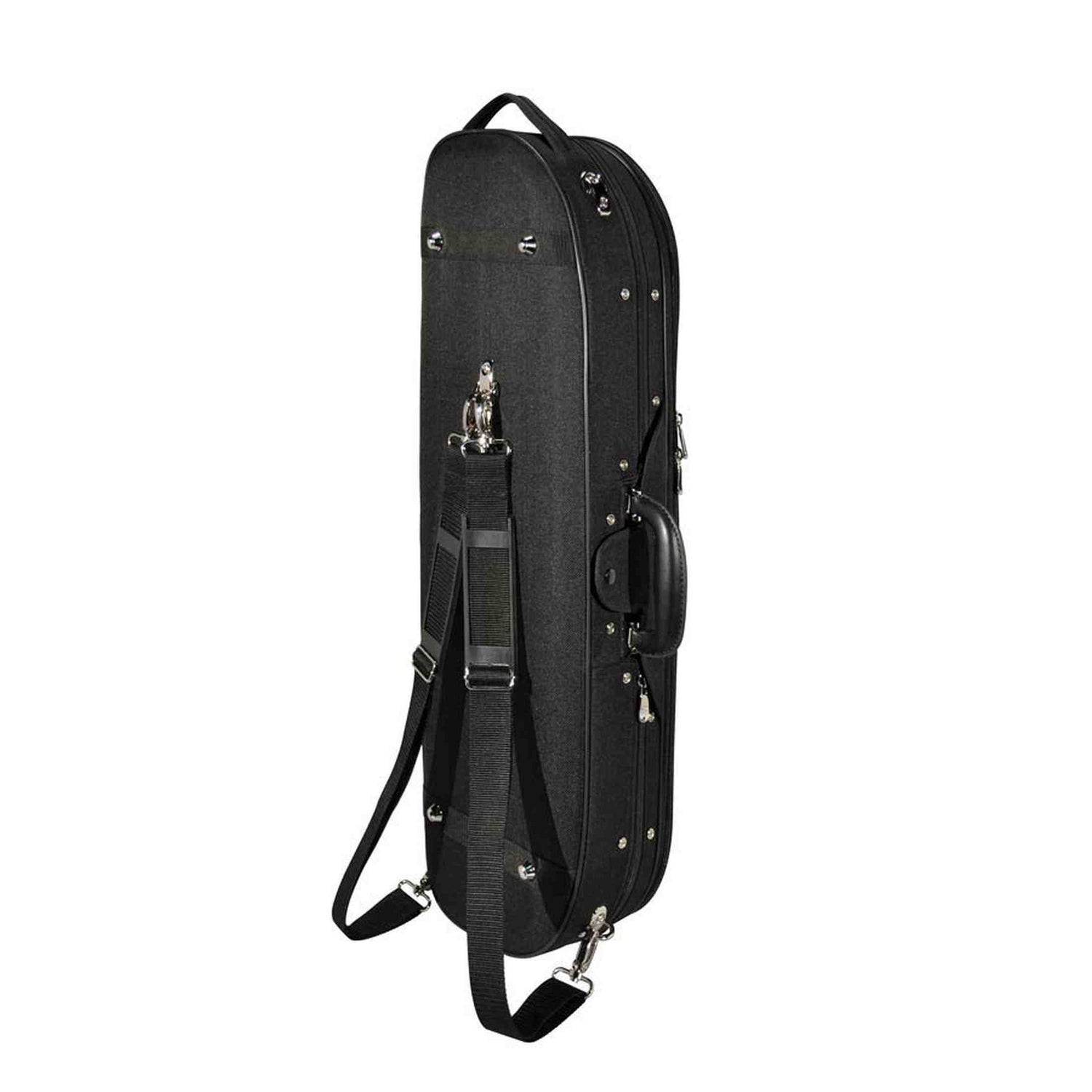De binnenzijde is afgewerkt met blauw suède en volledig gevoerd. Je neemt twee strijkstokken mee en bergt accessoires op in de twee interne vakken. De snarenkoker en beschermdoek zorgen voor extra overzicht en bescherming. Met de twee rugriemen draag je de koffer comfortabel naar les en repetitie.