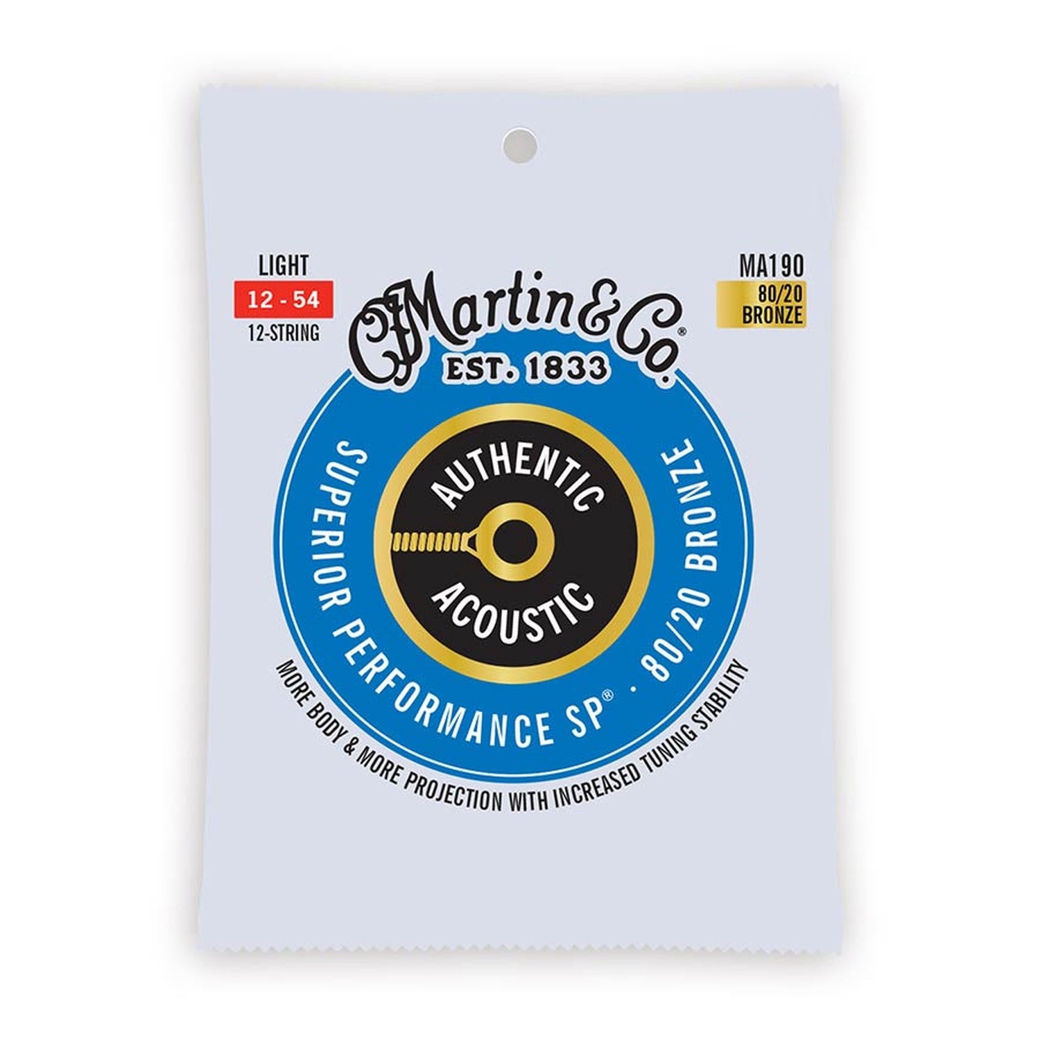 Martin & Co MA190 string set 12-string 80/20 bronze, light 012-012 016-016 025-010 032-014 042-020 047-027 These strings are engineered with the performer in mind and they will always stand up to rigorous practice and performance schedules. We start with our highest tensile-strength core wire, then tin-plate it on all six strings for added corrosion resistance; because what you don't see matters! When coupled with our highest quality wrap wire you get consistent true tone that you can count on song after song. Available in 80/20 Bronze and 92/8 Phosphor Bronze.