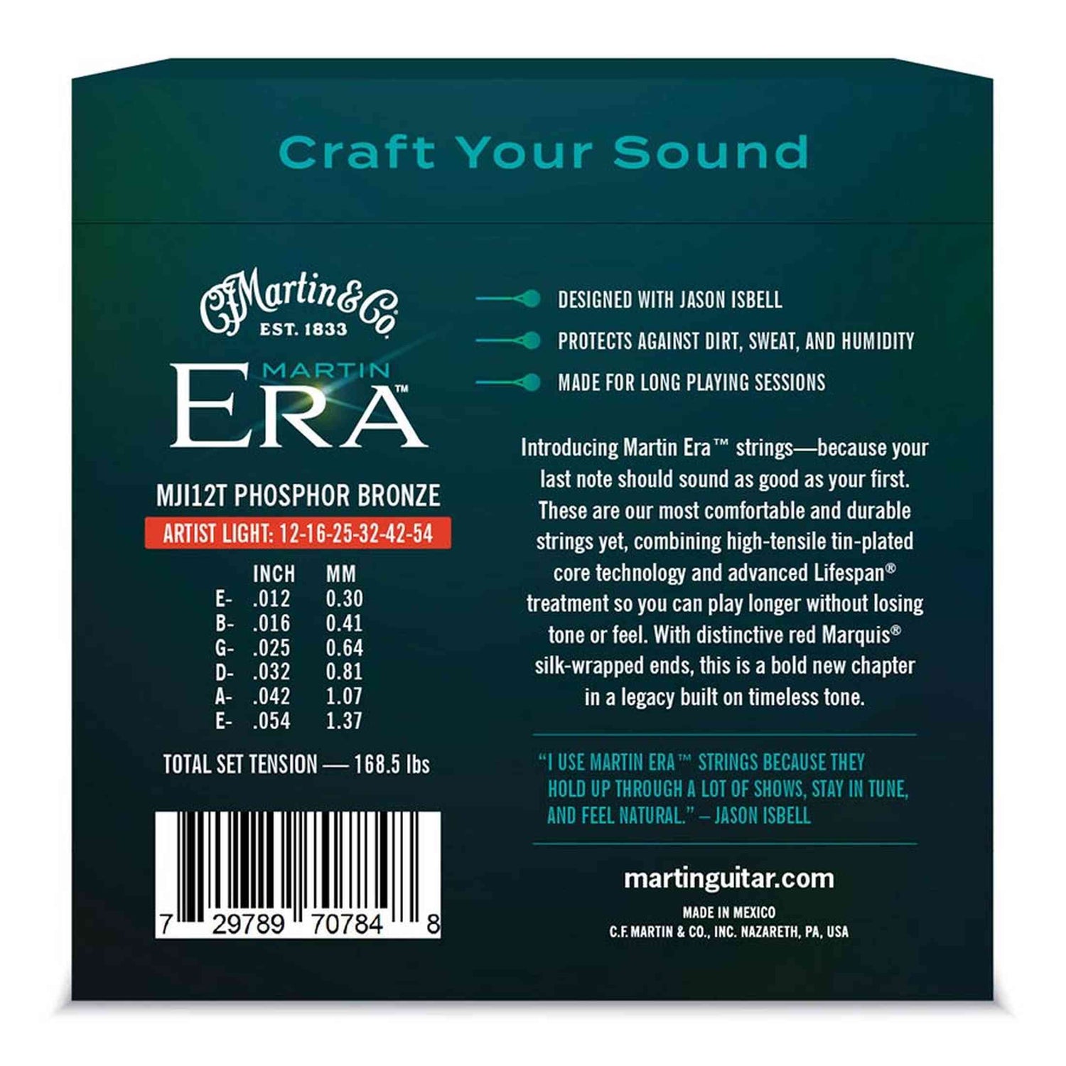 Developed in collaboration with Jason Isbell, the Martin & Co MJI12T string set offers balanced tone with a familiar feel. This Artist Light set uses a traditional SP® core for a direct response and powerful projection. The phosphor bronze strings are treated with Lifespan® coating to prevent oxidation, allowing you to play longer with consistent tone quality.