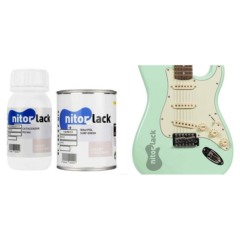 NitorLACK N167013108 is a dual-coat polyurethane lacquer in Surf Green , inspired by the iconic '57 Chevy and used by Fender between 1960 and 1965, primarily on Stratocaster models with white pickguards. This soft, fresh green hue symbolizes the beginning of the Custom Color era and remains a favorite among vintage enthusiasts to this day.