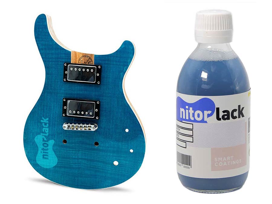 The NitorLACK N410406112 NitorAQUA Aquamarine is a brilliant water-based stain with a bright blue-green hue. This aquamarine color is perfect for staining wooden musical instruments such as guitars and basses, providing a fresh, vibrant appearance while still allowing the wood grain to shine through. It's ideal for those who want to give their instrument a unique and modern look without sacrificing the wood's natural texture.