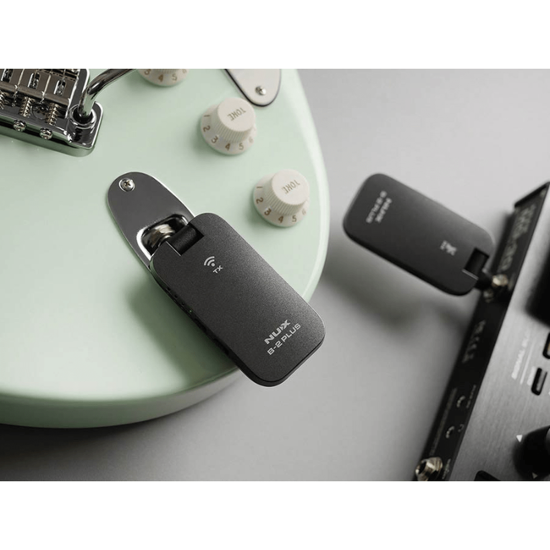 NUX B-2 PLUS The NUX B-2 PLUS is a pocket-sized wireless system that offers guitarists a simple solution to going wireless. Using the latest NUX wireless transmission algorithm, the B-2 PLUS ensures a better connection in noisy RF environments. Thanks to the newly added auto-off function, you never have to worry about accidentally leaving the system on and draining the batteries.