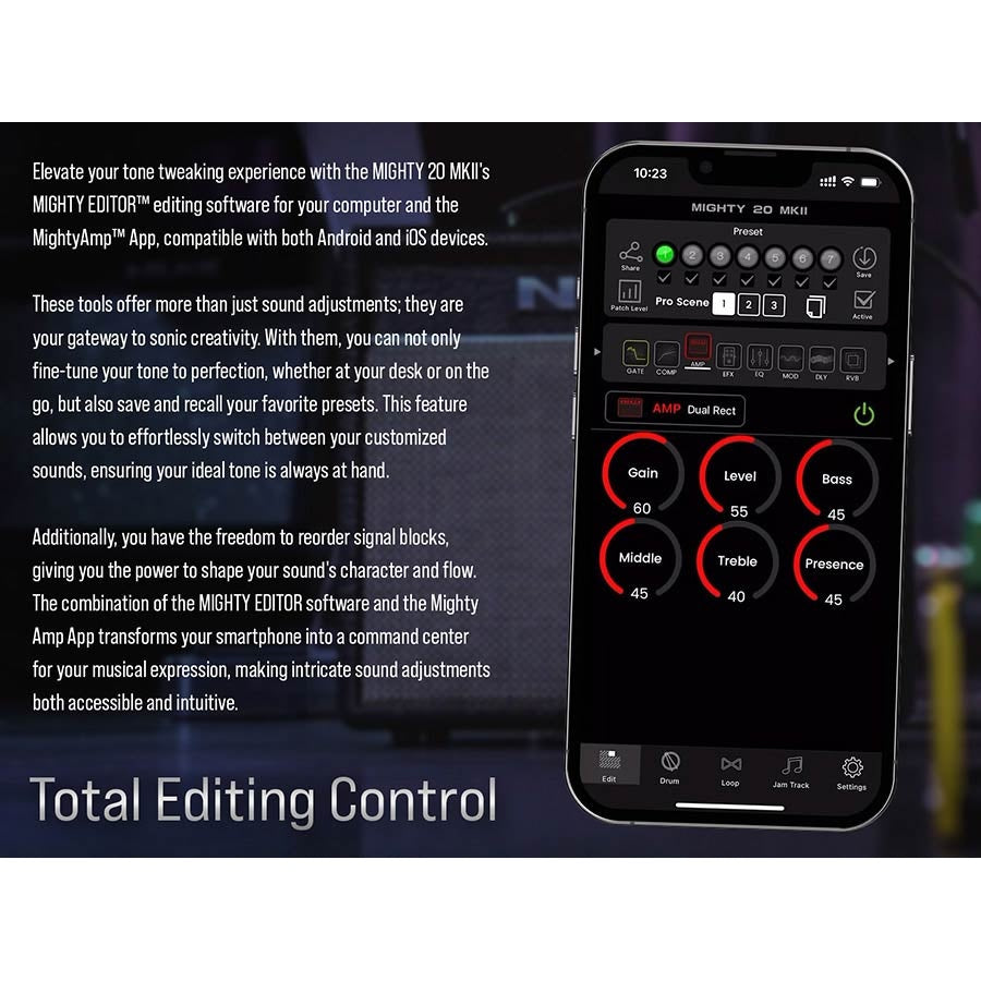 In addition to its realistic amp models, the MIGHTY-20MK2 offers a wide range of effects, including delays, reverbs, compressors, and more. Its integrated 60-second looper and drum machine make it a creative tool for both practicing and performing. The included NUX NBT-1 Bluetooth module provides wireless control via the MightyAmp™ app and audio streaming. With USB audio interface functionality, silent practice options, and compatibility with MIGHTY EDITOR software, this amp is a complete all-in-one solution for modern guitarists.