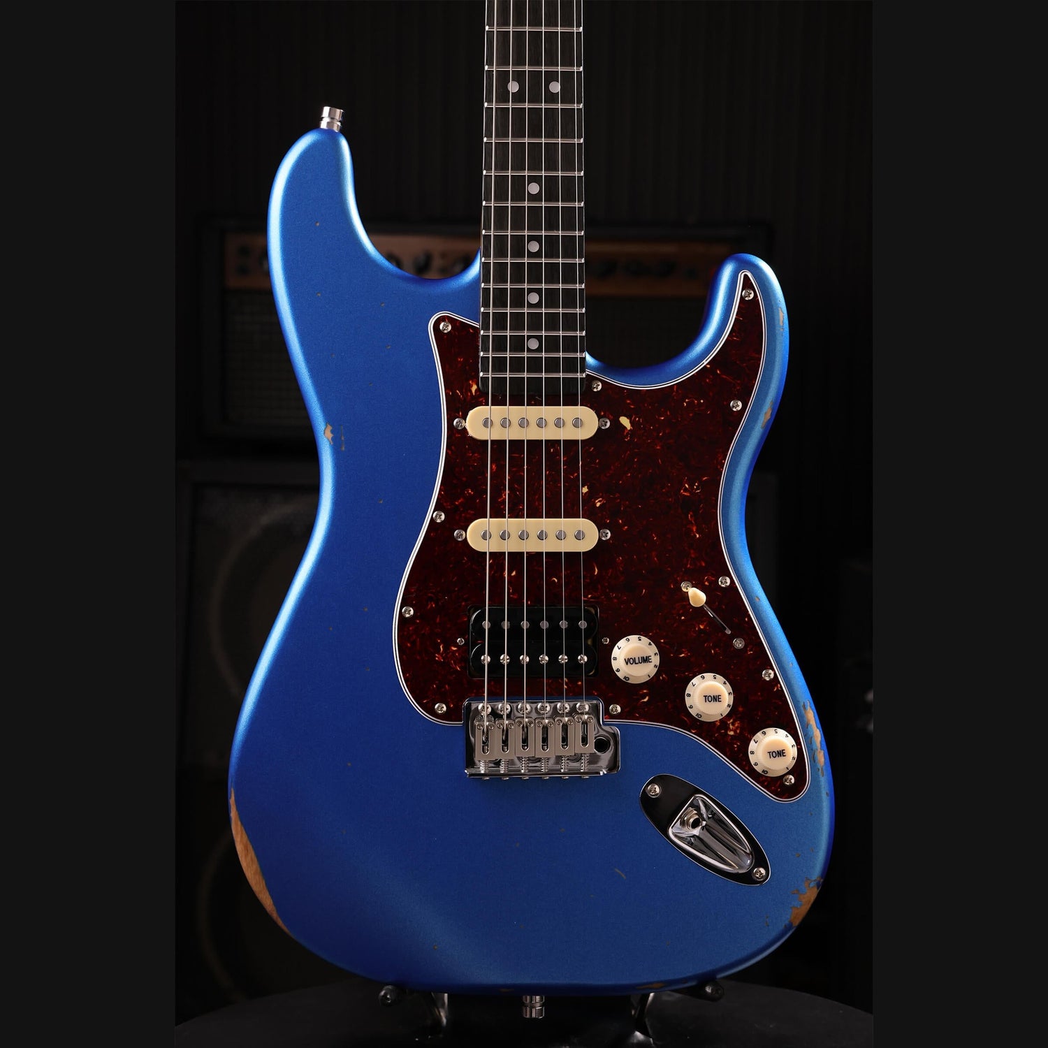 The Patina PS-7 LPB R is an S-style electric guitar with a HSS pickup configuration and a relic nitro finish. The single-coil pickups in the neck and middle positions deliver bright, detailed tones. The humbucker in the bridge position delivers more output and sustain for more powerful riffs and solos. This allows you to quickly switch between sparkling cleans and powerfully distorted sounds.