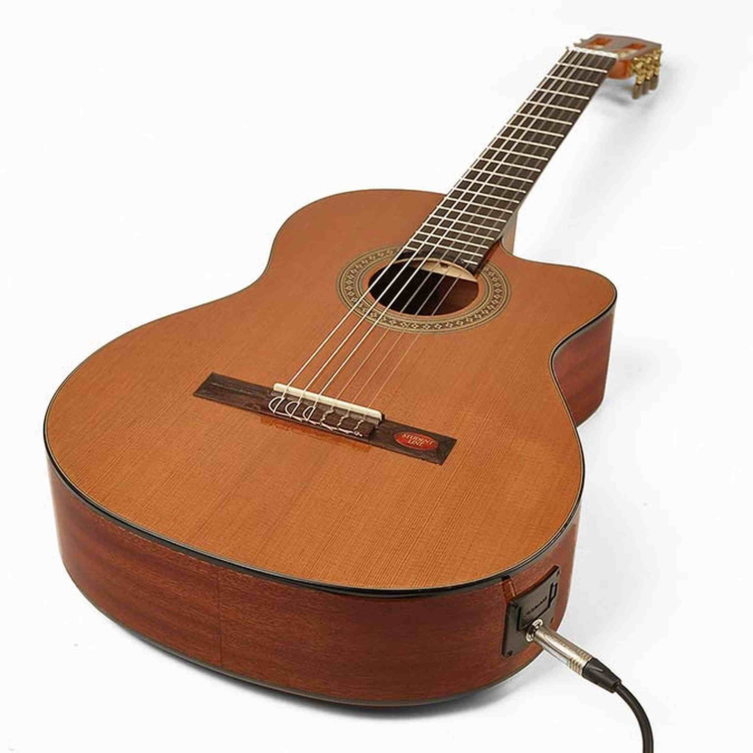 The Salvador Cortez CC-10CE is an accessible electro-acoustic classical guitar, ideal for beginning players who also want to perform or record. The solid-look cedar top gives the guitar a warm, rounded tone, while the sapele back and sides provide a bright, musical undertone. The cutaway allows easy access to the higher frets, making this guitar more versatile.