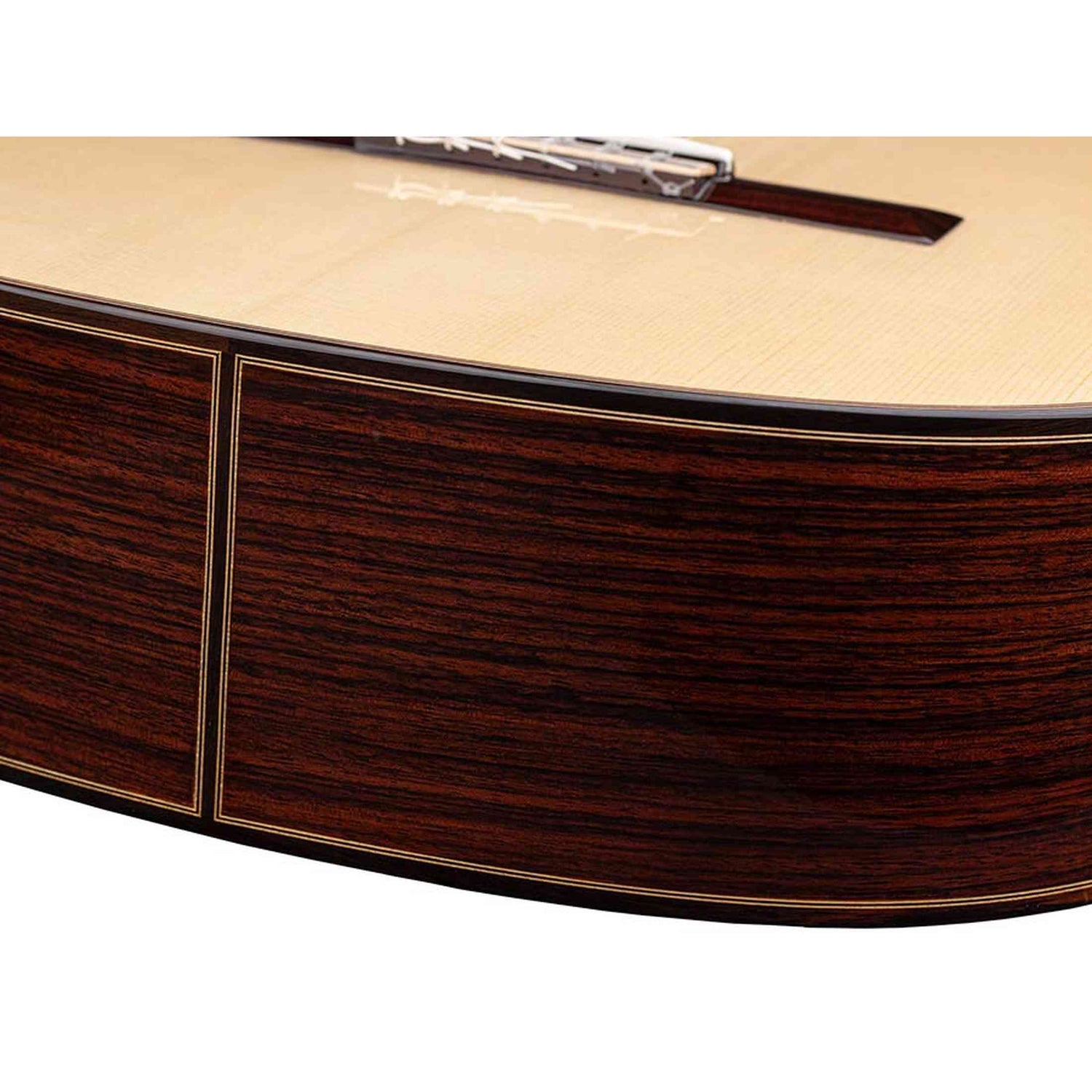 The Salvador Cortez CS-130 is an all-solid classical guitar with a European spruce top and solid Indian rosewood back and sides. Its slightly more compact body makes this guitar more portable without compromising tone quality. The sound is clear, refined, and rich in nuance – ideal for both practice and performance. The finish is stylish, with an ebony fingerboard, luxurious button block, and neat bindings that give the CS-130 a refined appearance.