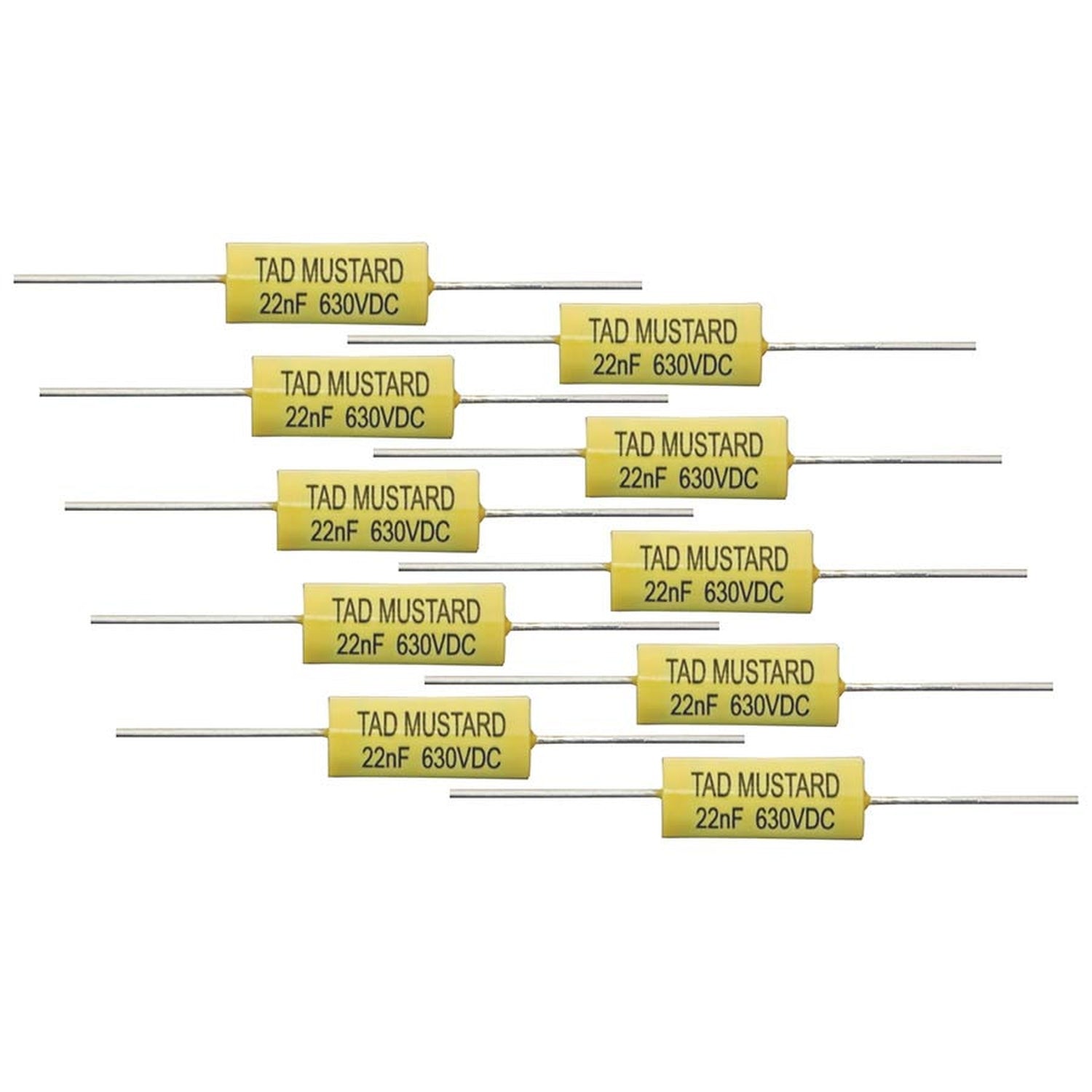 Discover the TAD VMC22/10 Mustard capacitors, a unique set of 10 with a capacitance of 0.022uF. These capacitors are a high-quality replica of the authentic film-to-foil aluminum/PE designs from the 1960s, as used in famous British amplifiers from the 1960s to the mid-1970s.
