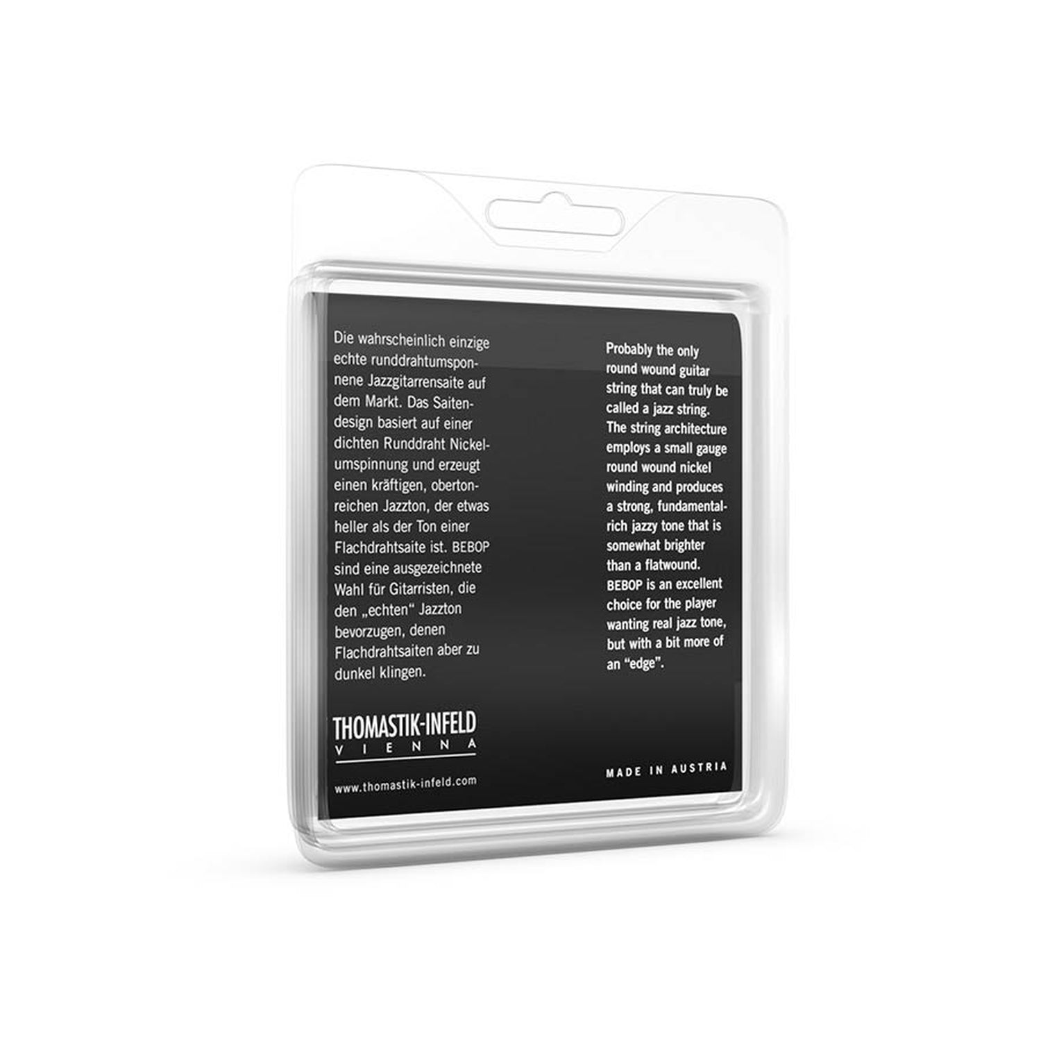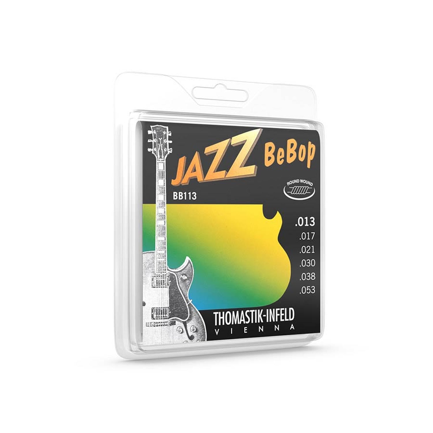 Thomastik Infeld THBB-113 electric string set, nickel roundwound, 013-017-021-030-038-053 Probably the only round wound guitar string that can truly be called a jazz string. A similarity to the JAZZ SWING in materials and string architecture, but with a small gauge round wound nickel winding, produces a strong, fundamental rich jazzy tone that is somewhat brighter than a flatwound. This remarkable string is an excellent alternate choice or the player wanting real jazz tone, but with a bit more of an "edge".
