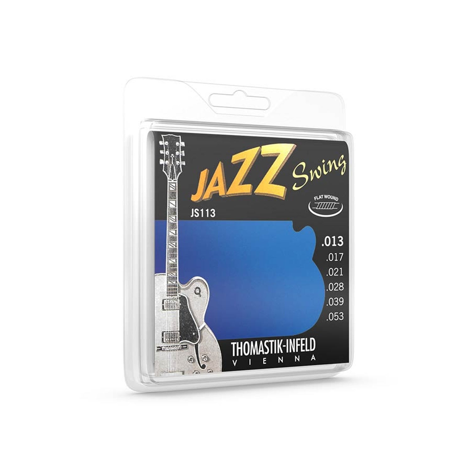 Thomastik Infeld THJS-113 string set electric, nickel flatwound, 013-017-021-028-039-053 This is the legendary flatwound jazz guitar string! A list of its players reads like a Jazz Hall of Fame, and it's still the undisputed king of flatwounds, for many of today's jazz greats. A true flatwound (not a “ground wound” or “compressed wound” like some of the pretenders) with glassy smooth polished nickel winding on a round core, it has the perfect balance of fundamental to overtones required for traditional jazz. Some players claim that its mellow, powerful tones actually improve with age!
