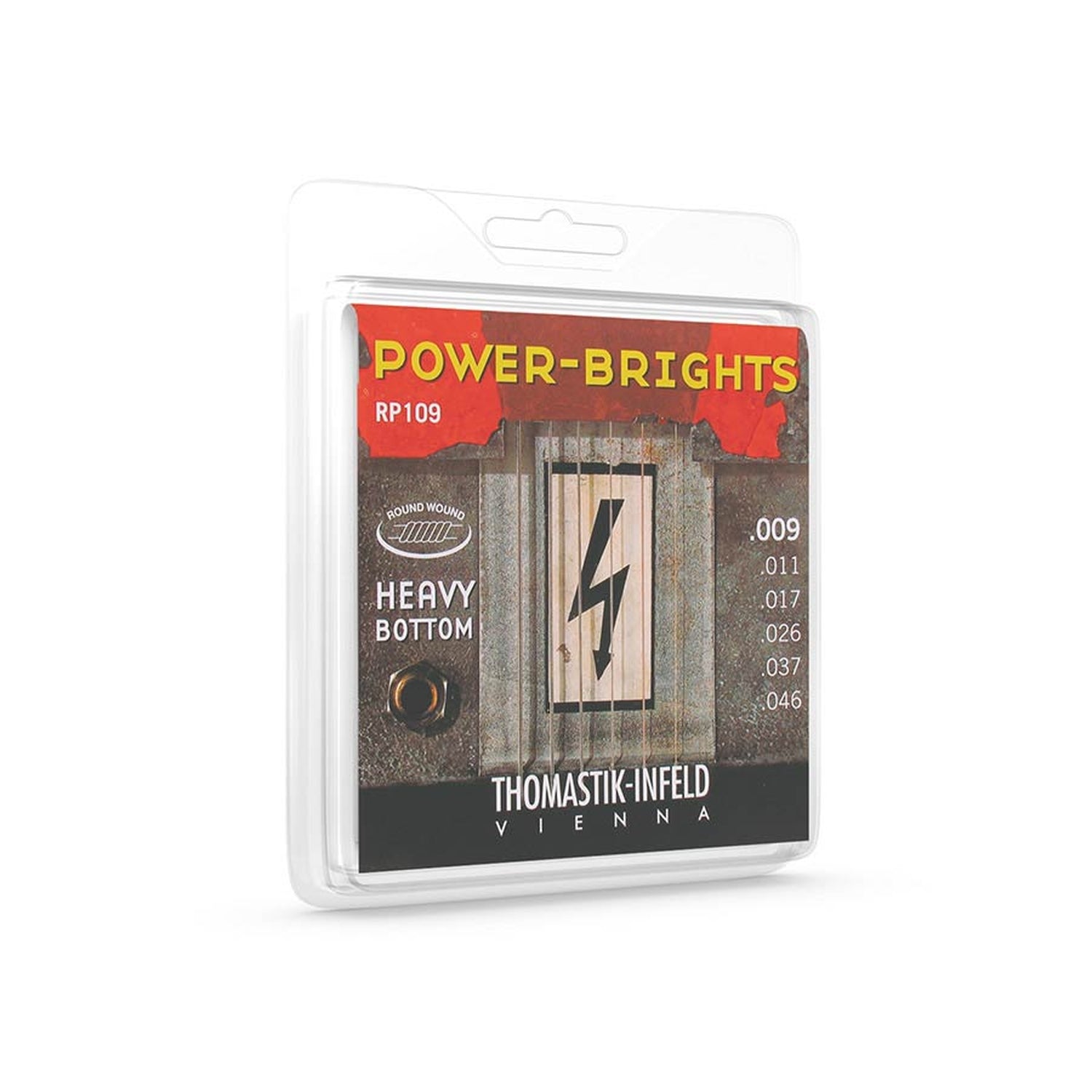 Thomastik Infeld THRP-109 string set electric, magnecore, 009-011-017-026-037-046 Roundwound Magnecore alloy on a flexible hexcore for a bright aggressive tone, extra long sustain and reduced playing effort. Designed to enhance harmonics and percussive effects like tapping. High output: POWER-BRIGHTS love distortion!